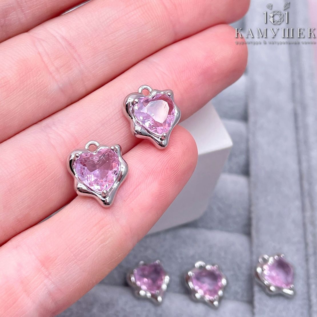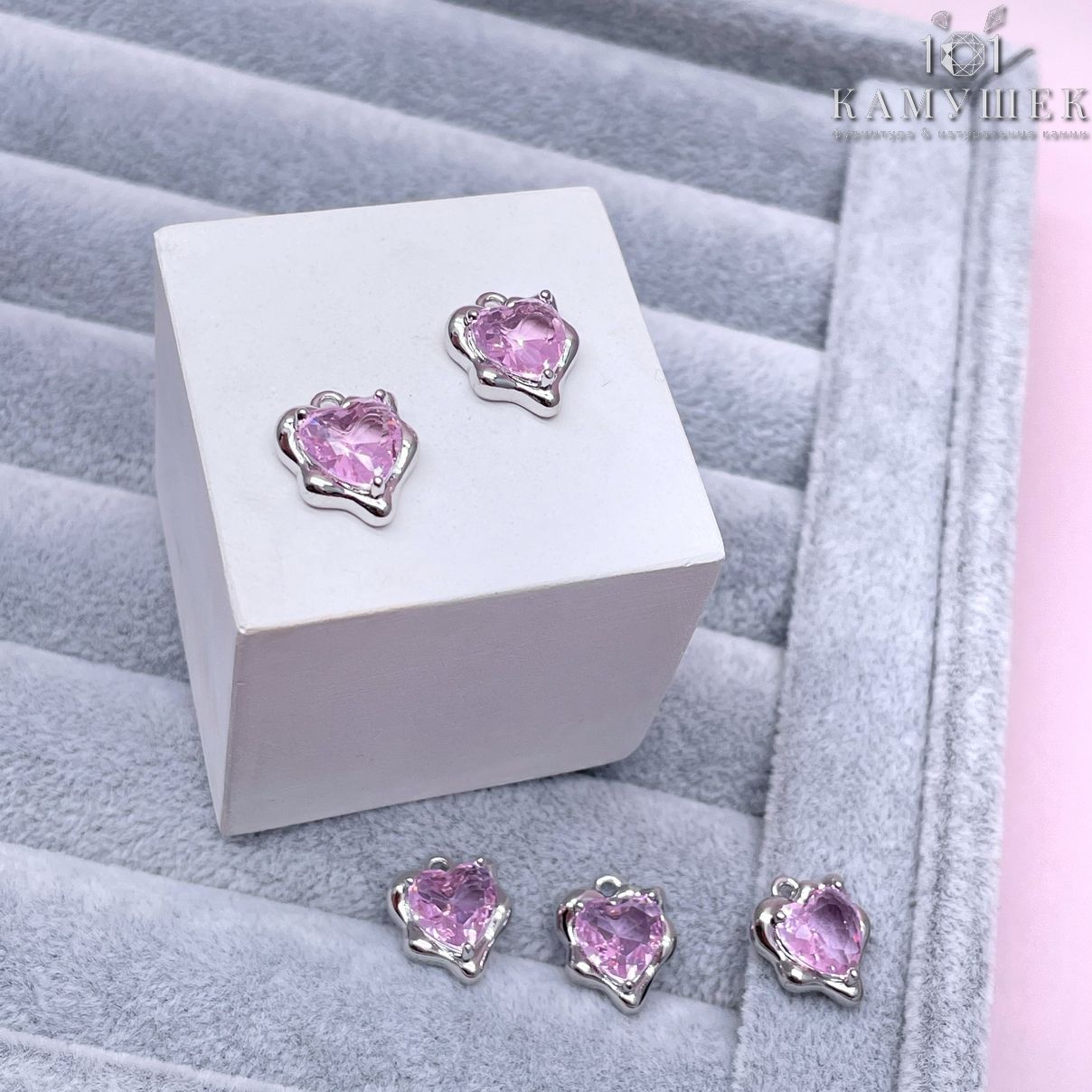 Подвеска сердце фриформ розовый циркон, цвет серебро 11х13 мм