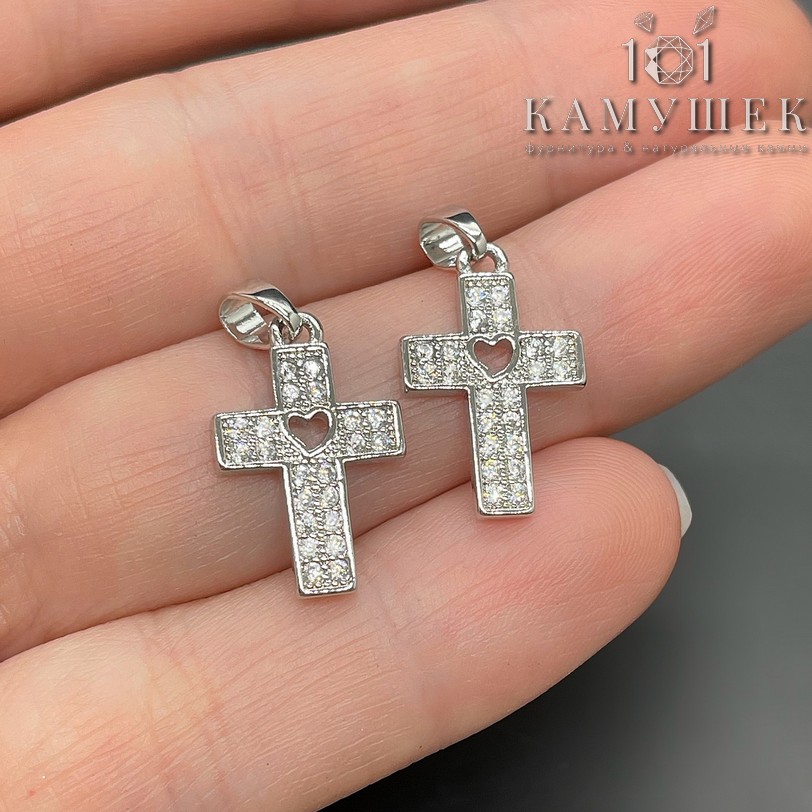 Подвеска Крест сердце c цирконами, цвет серебро 17х11 мм