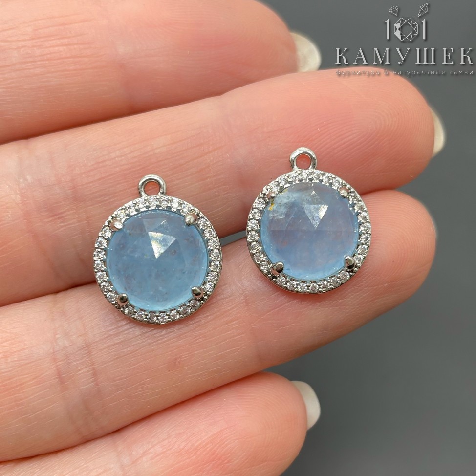 13 мм, цвет серебро Подвеска круг Кварц тонированный голубой огранка в обрамлении цирконы