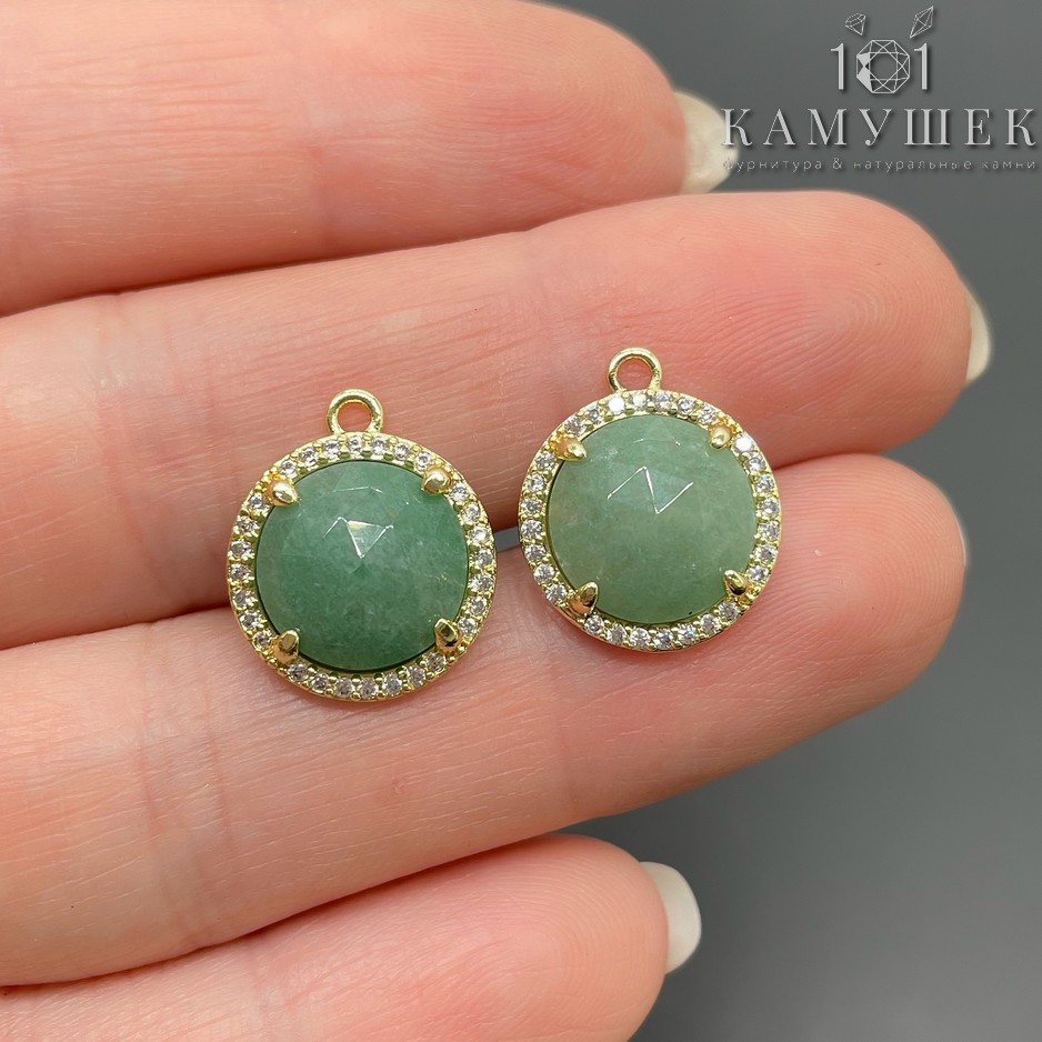13 мм, цвет золото Подвеска круг Авантюрин зеленый огранка в обрамлении цирконы