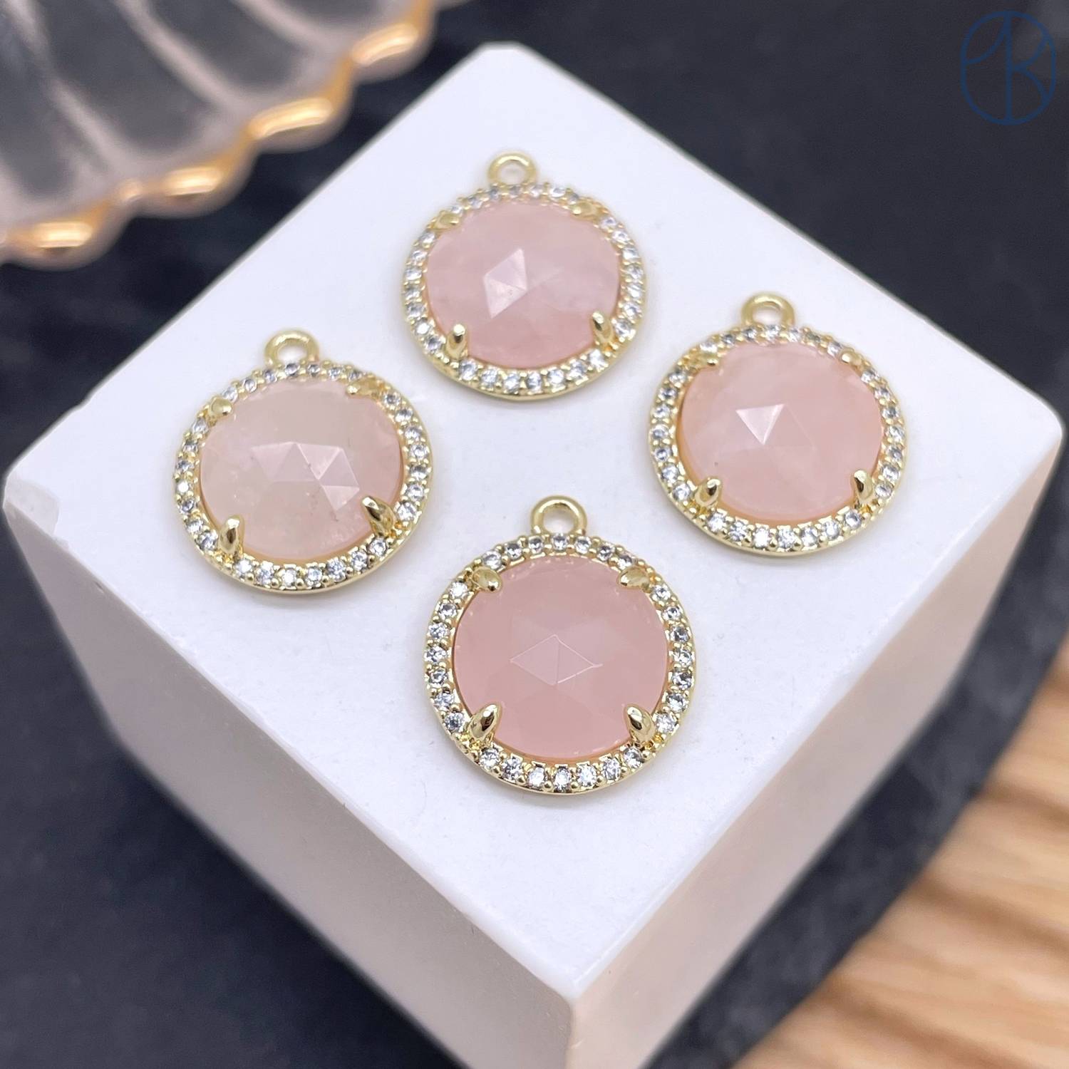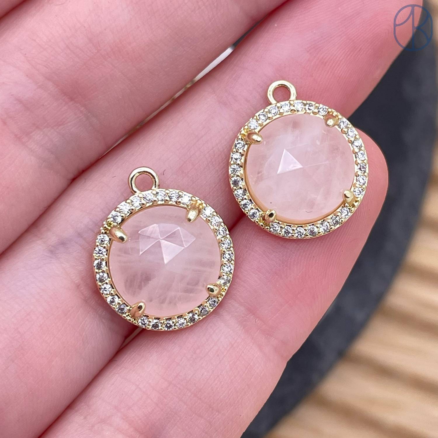 13 мм, цвет золото Подвеска круг розовый кварц огранка в обрамлении цирконы