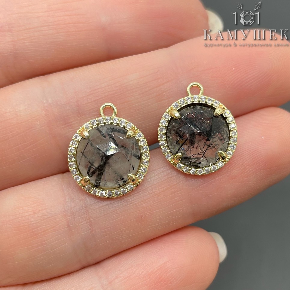 13 мм, цвет золото Подвеска круг Турмалиновый кварц огранка в обрамлении цирконы