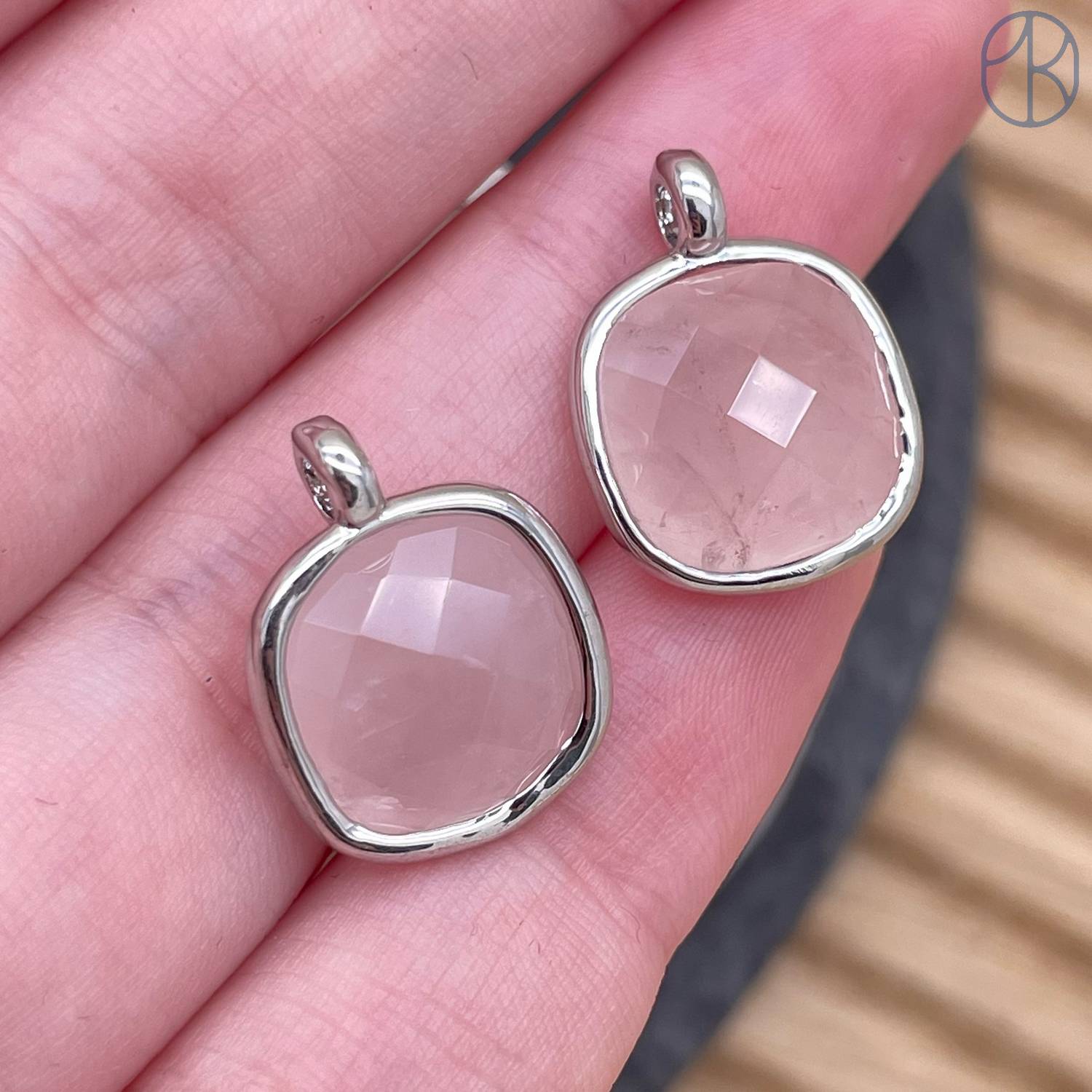 13мм, цвет серебро, Подвеска квадрат Розовый кварц в обрамлении