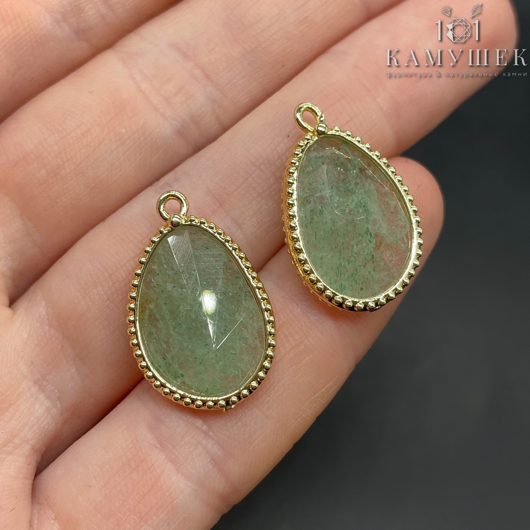 Подвеска капля кварц зеленый клубничный, цвет золото 23 мм