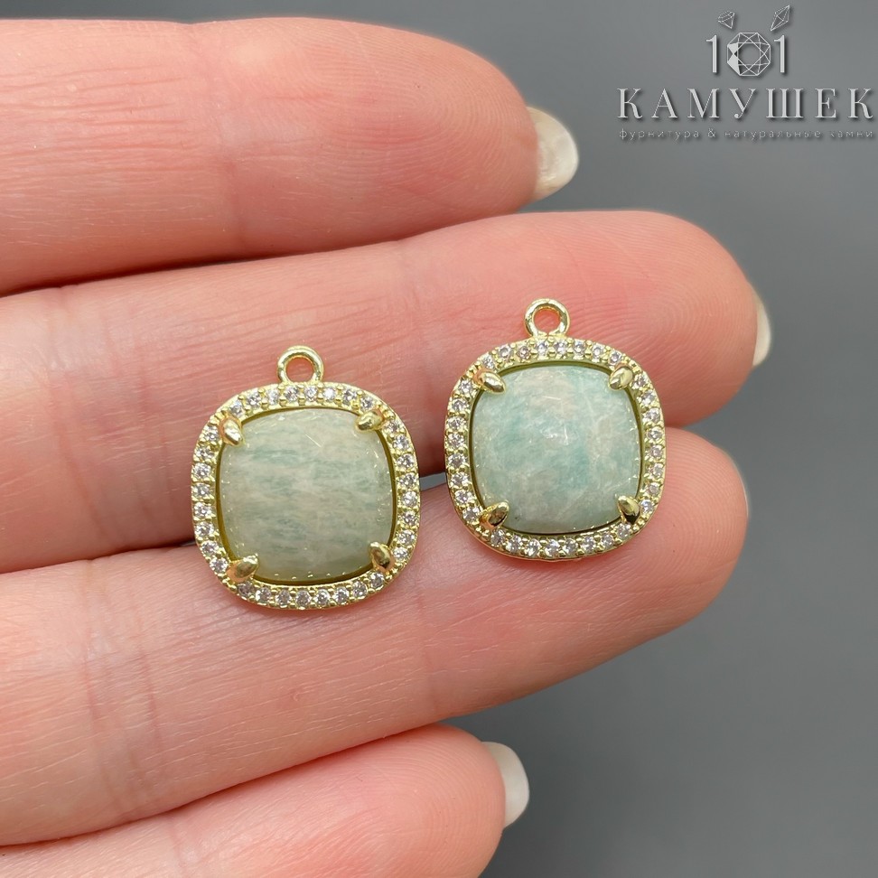 Подвеска квадрат цирконы амазонит, цвет золото 14 мм