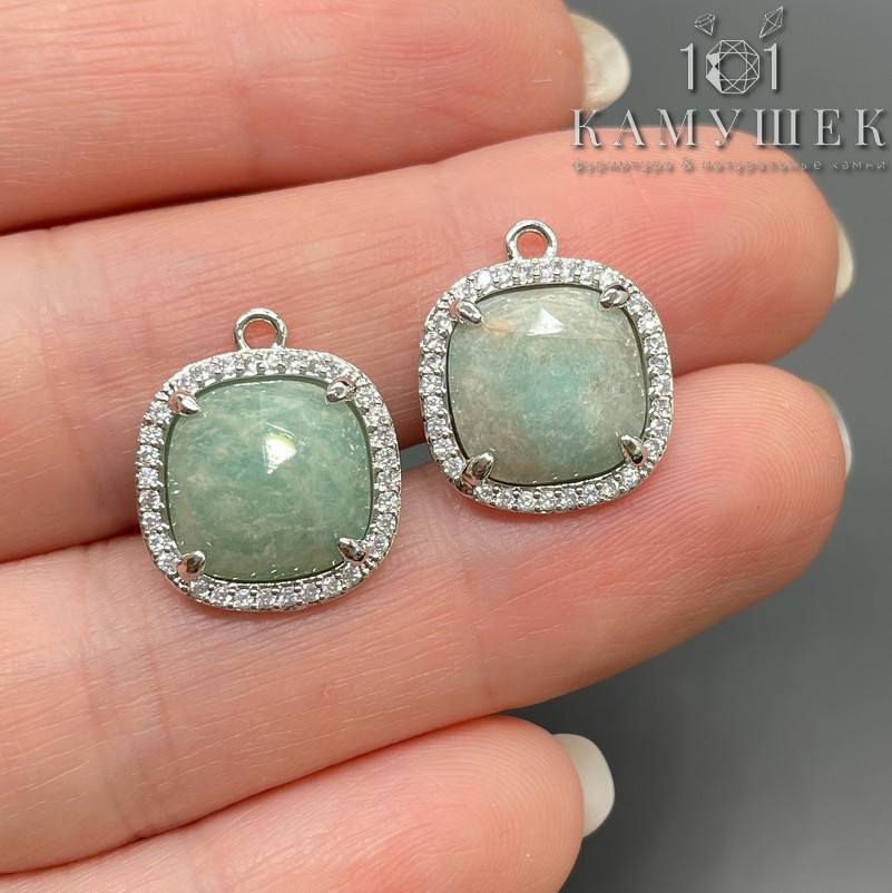 14мм, цвет серебро, Подвеска квадрат Амазонит в обрамлении цирконы