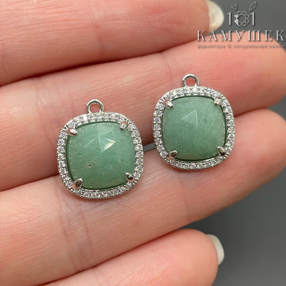 14мм, цвет серебро, Подвеска квадрат Авантюрин в обрамлении цирконы