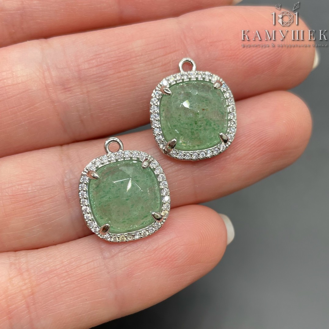 14мм, цвет серебро, Подвеска квадрат кварц тонированный зеленый в обрамлении цирконы