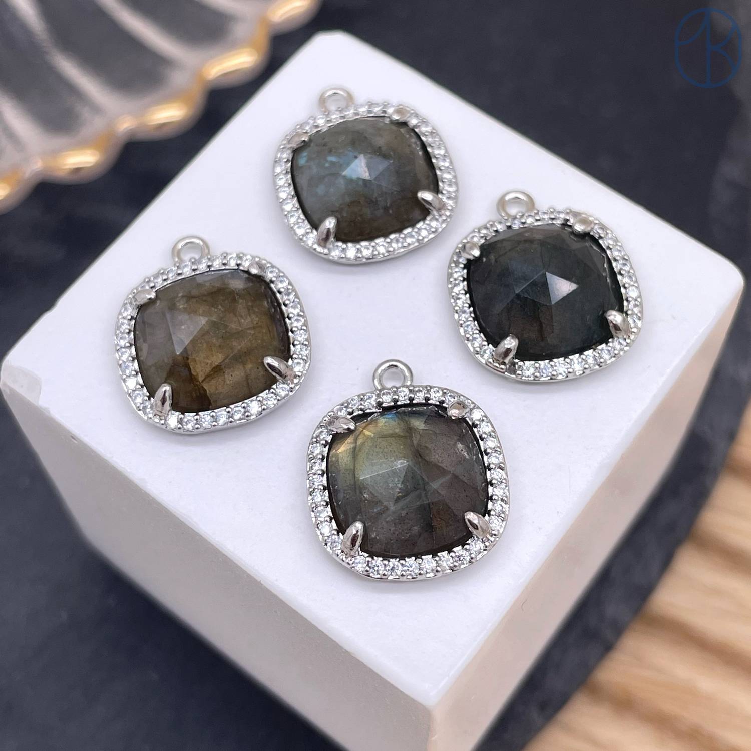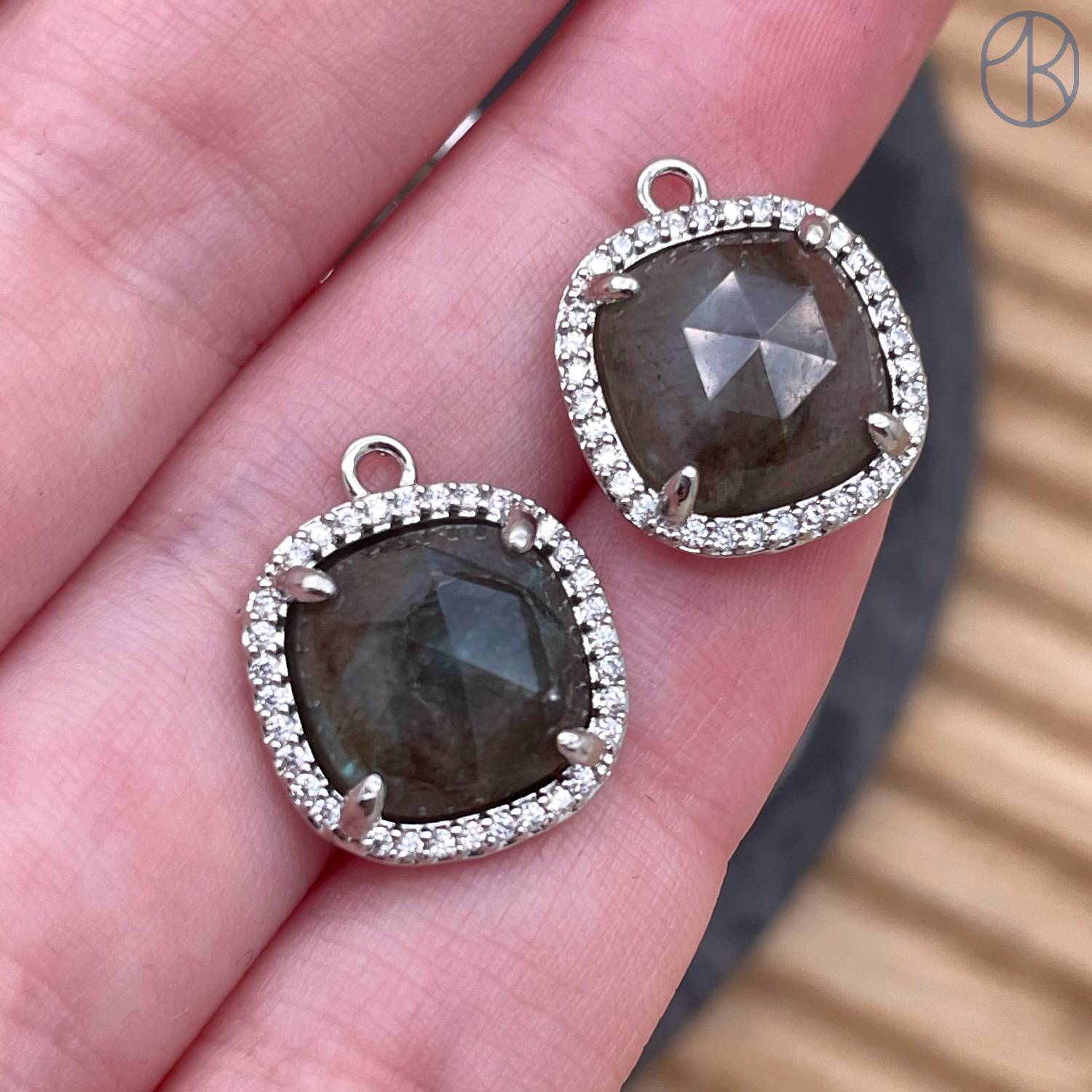 14мм, цвет серебро, Подвеска квадрат Лабрадор в обрамлении цирконы