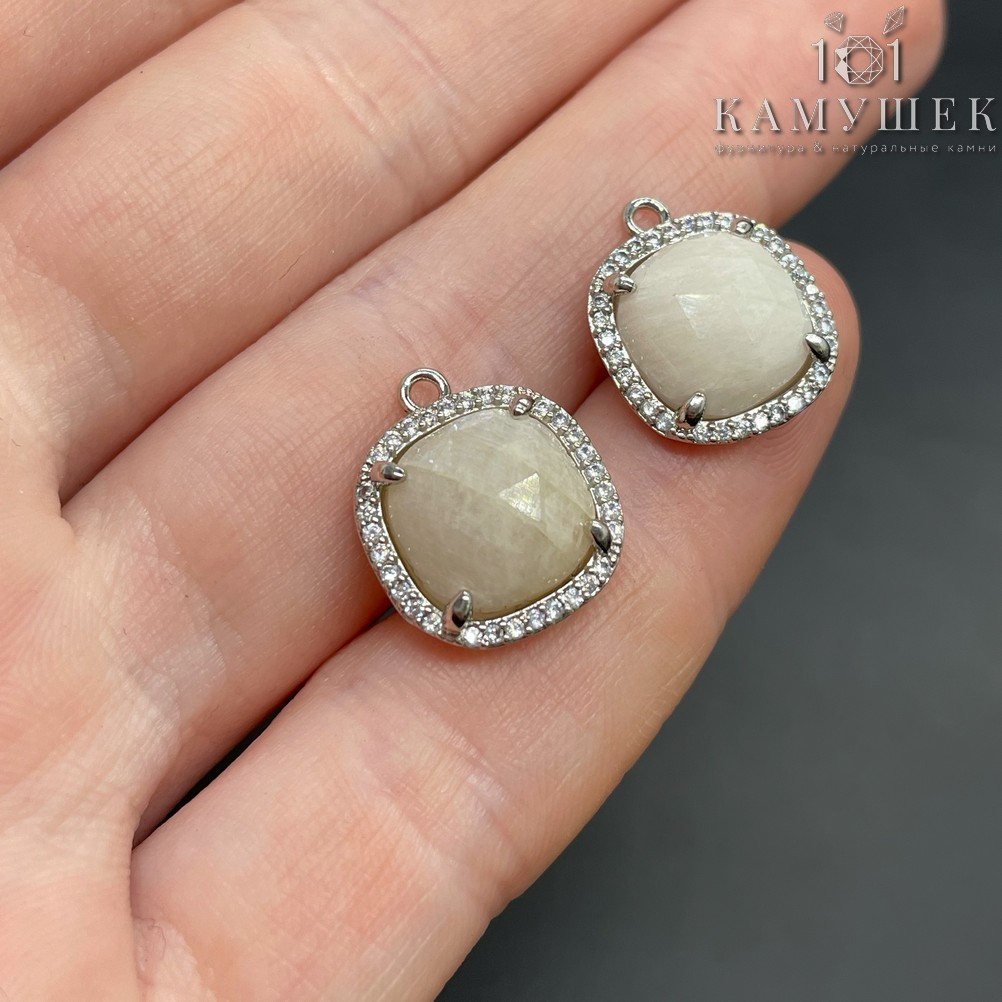 14мм, цвет серебро, Подвеска квадрат Лунный камень в обрамлении цирконы