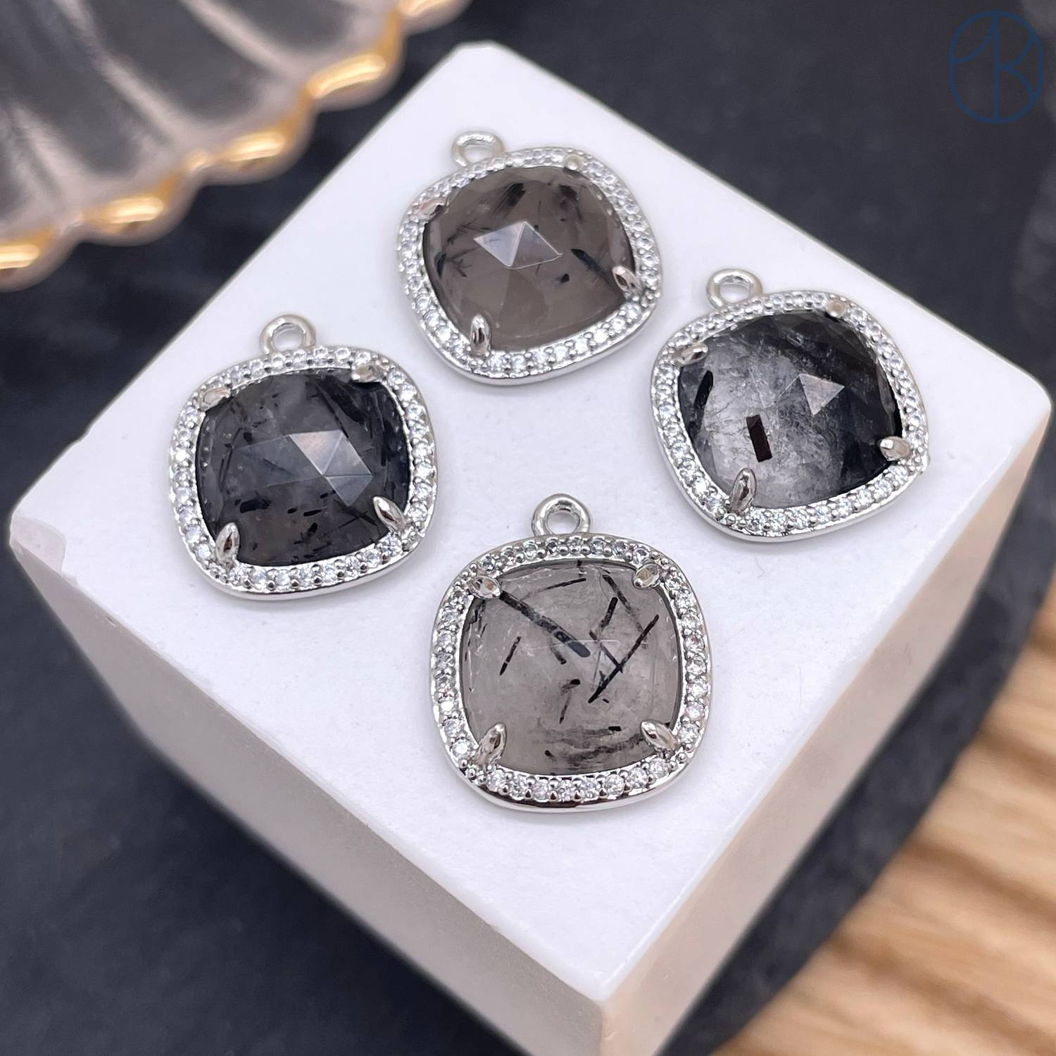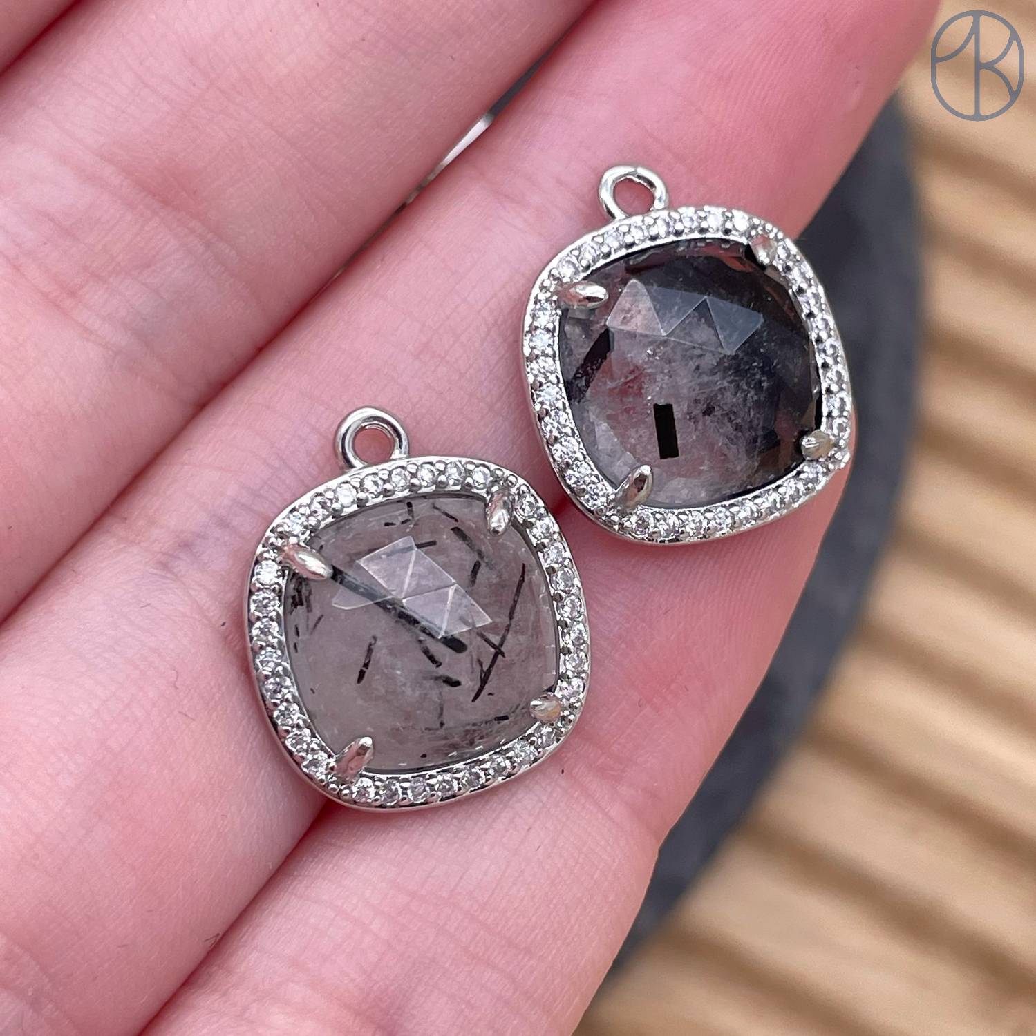 14мм, цвет серебро, Подвеска квадрат Турмалиновый кварц в обрамлении цирконы