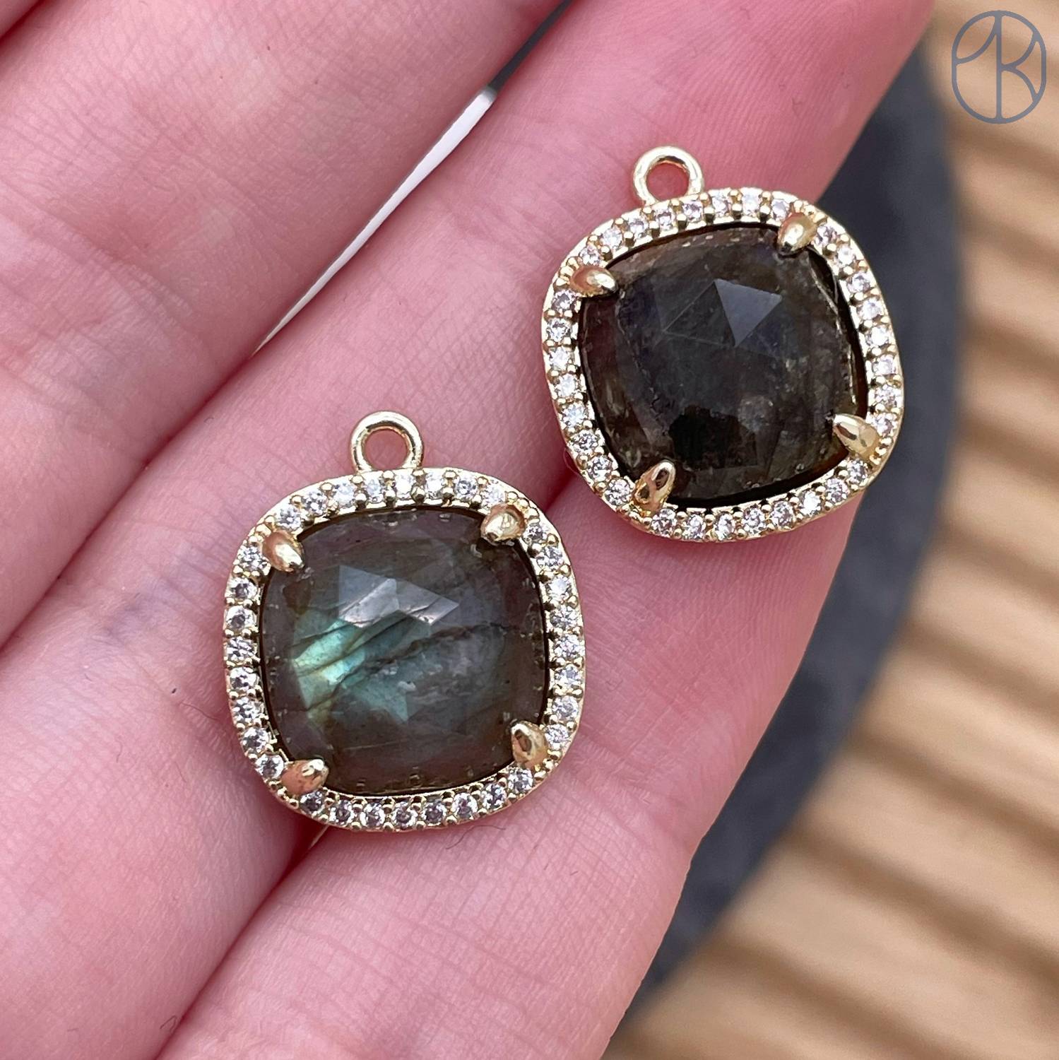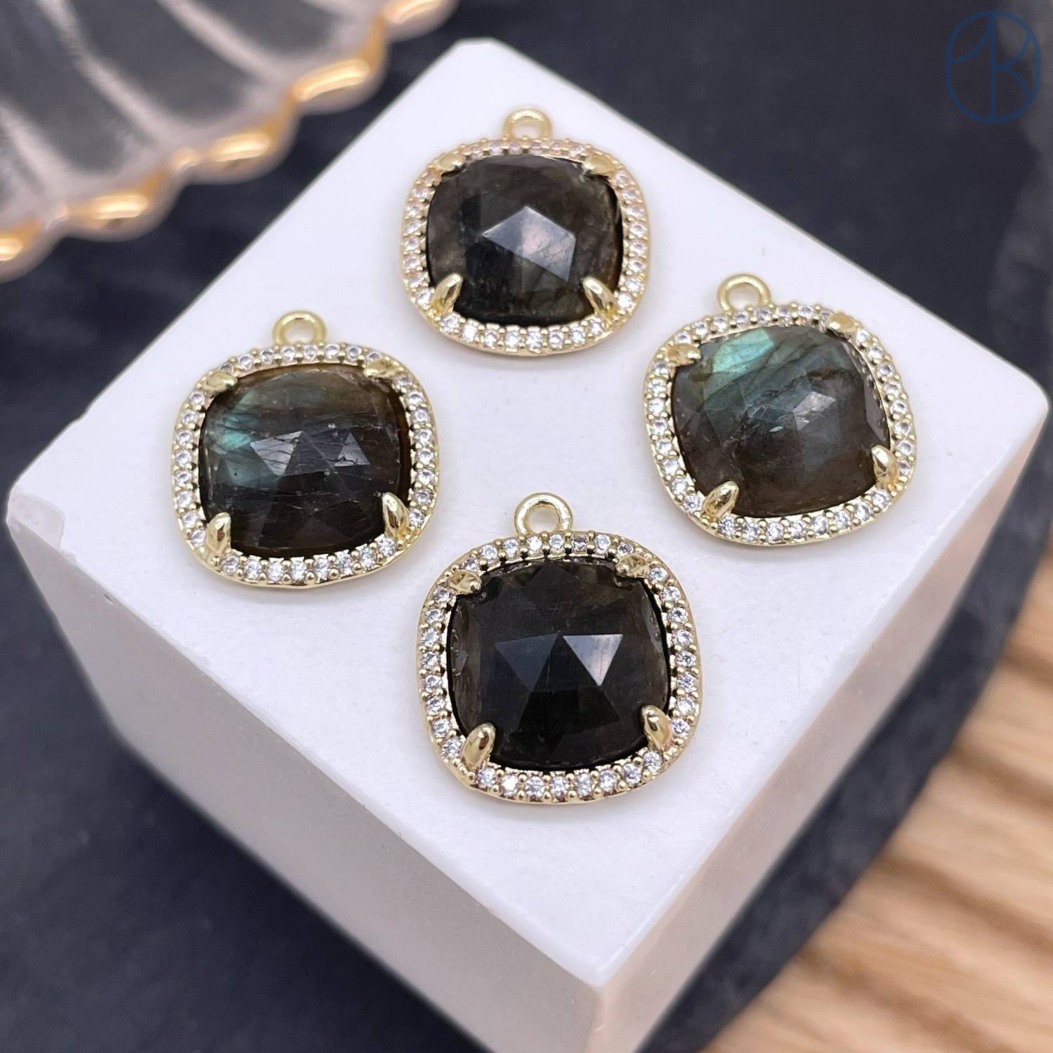 14мм, цвет золото, Подвеска квадрат Лабрадор в обрамлении цирконы