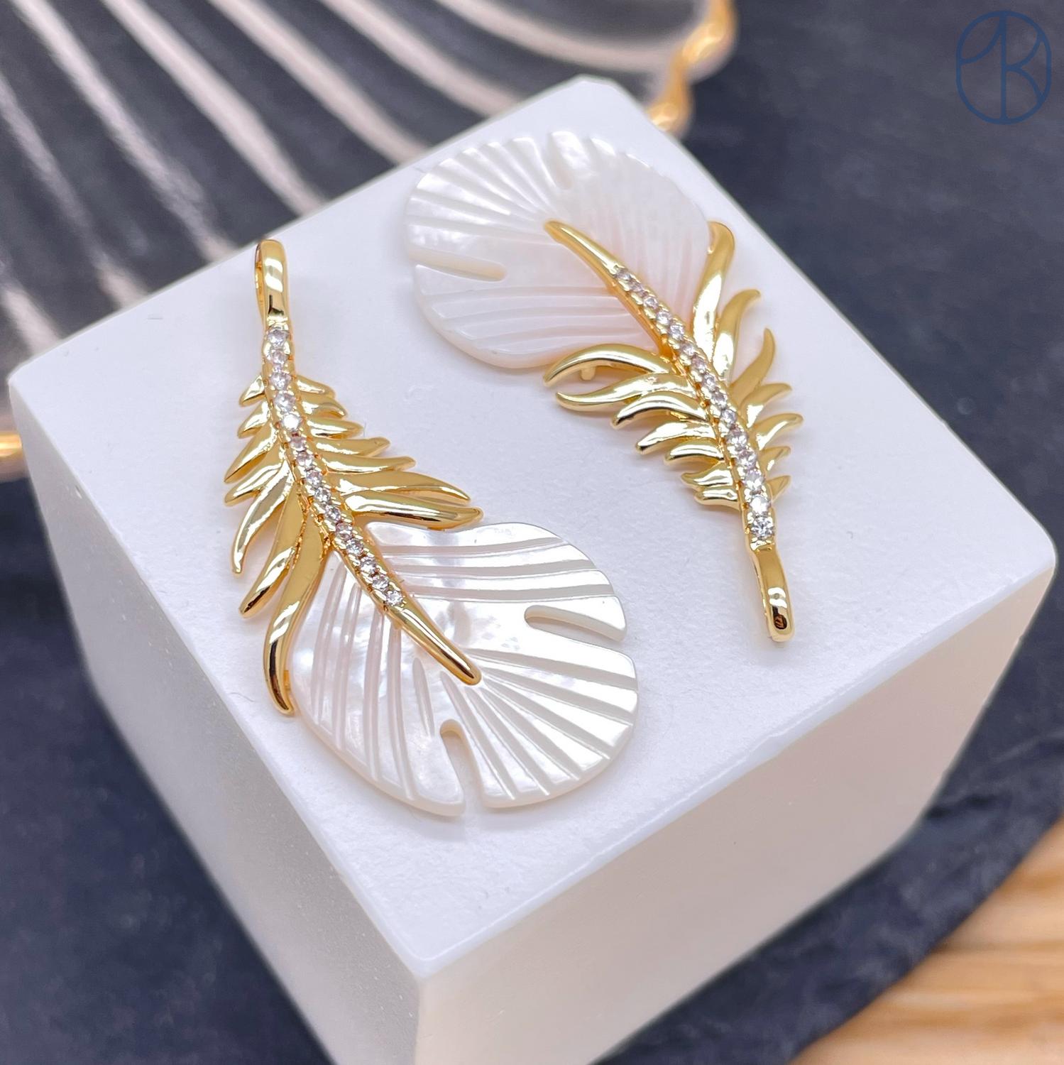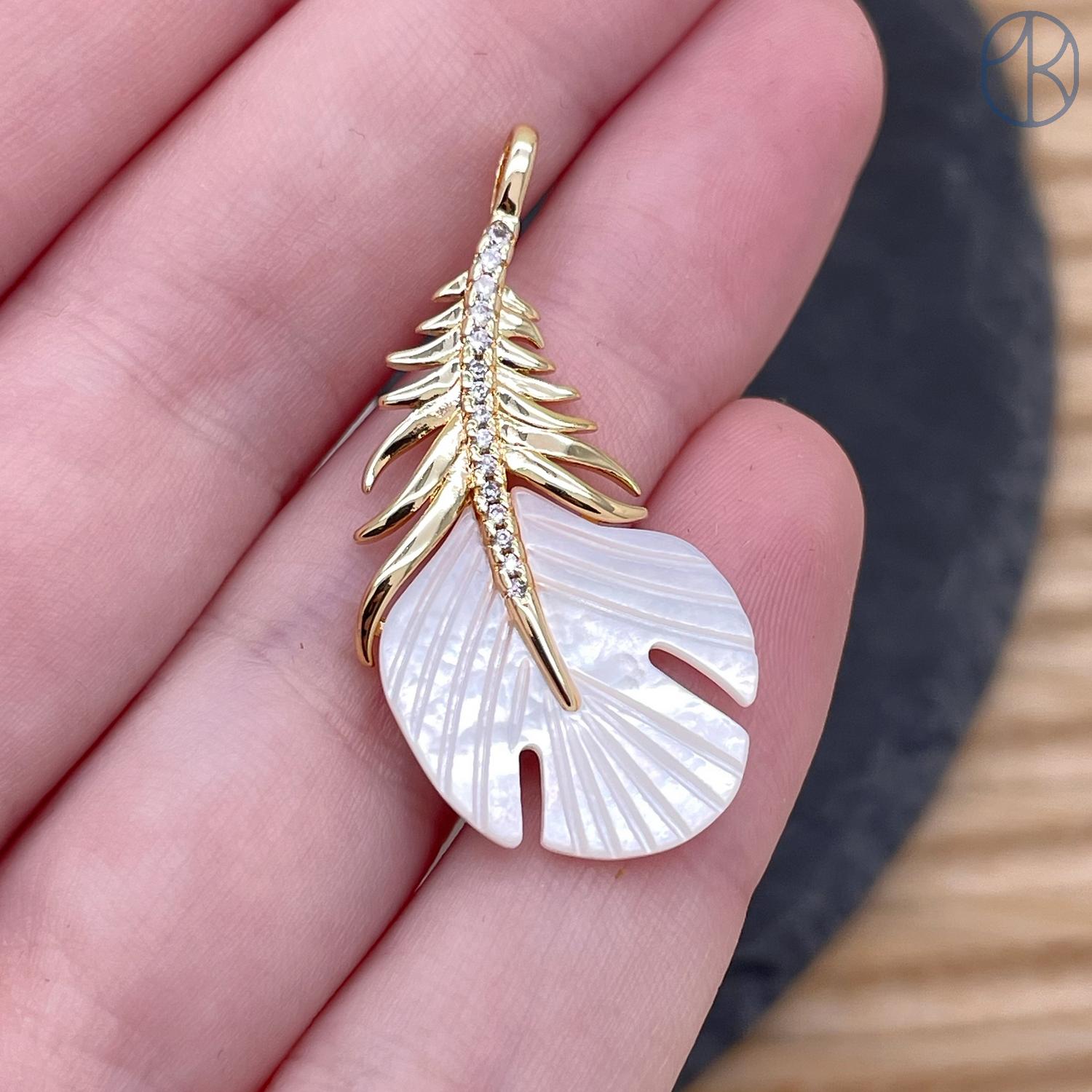 Подвеска перо белый перламутр, цвет золото 33x16 мм
