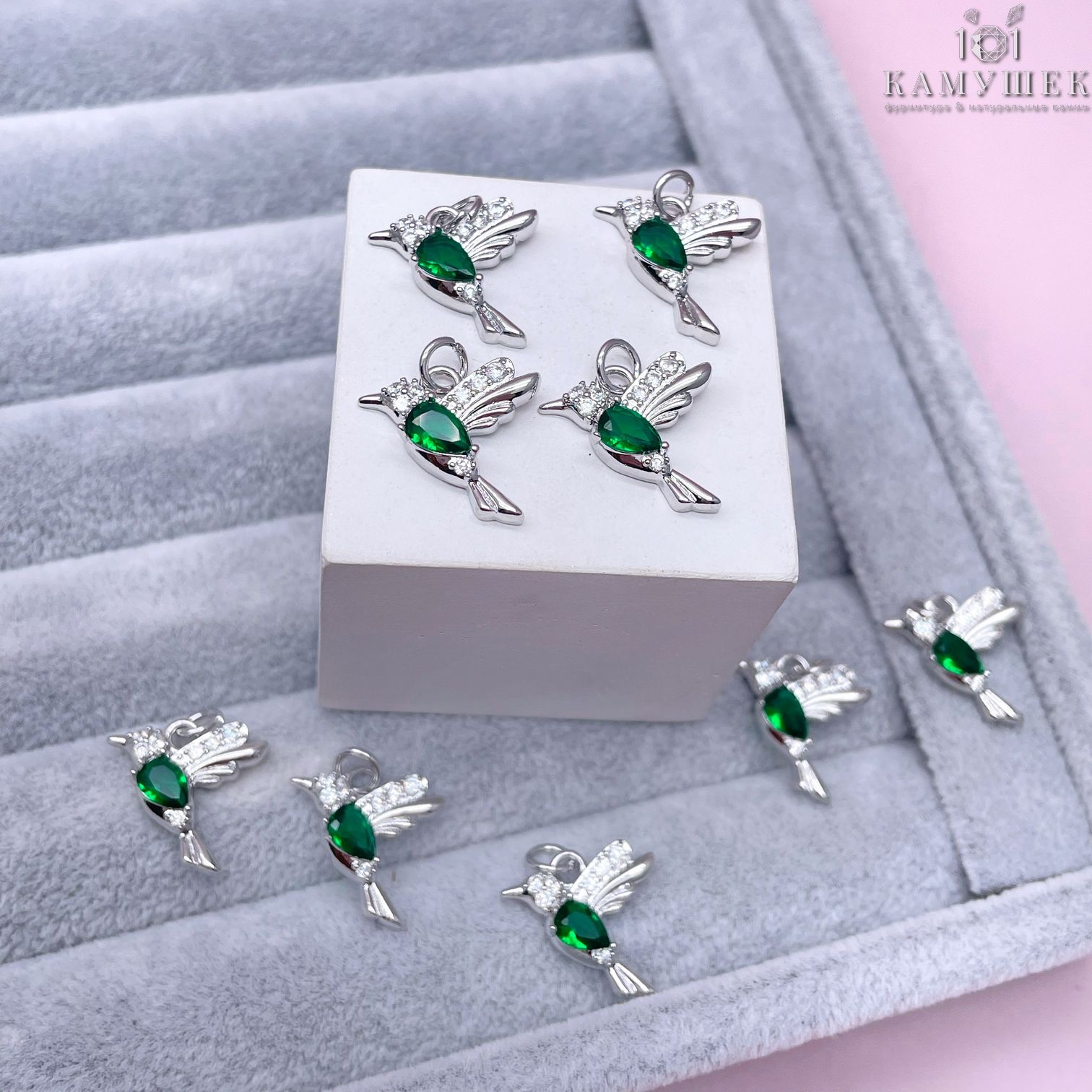 Подвеска колибри зеленый циркон, цвет серебро 16х16 мм