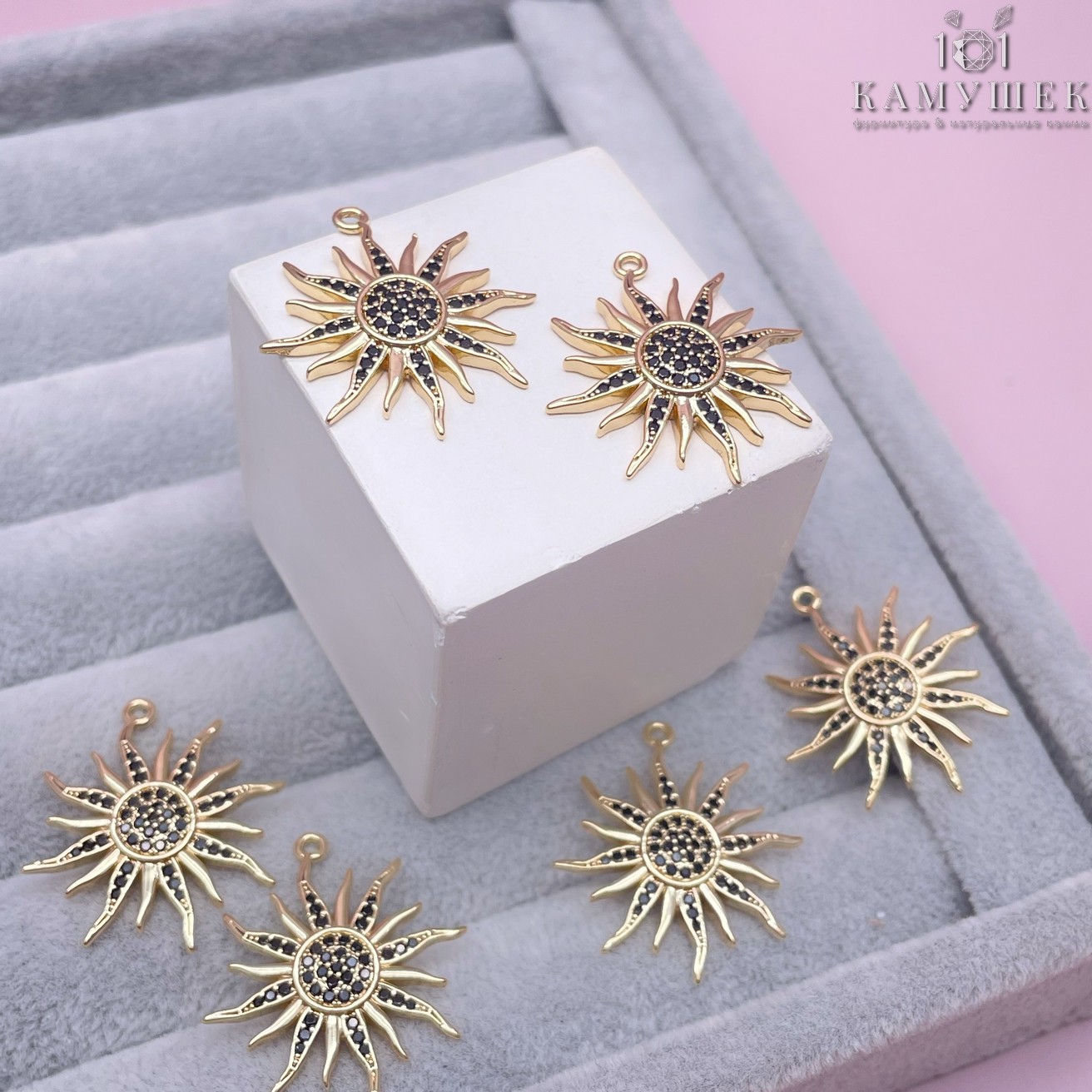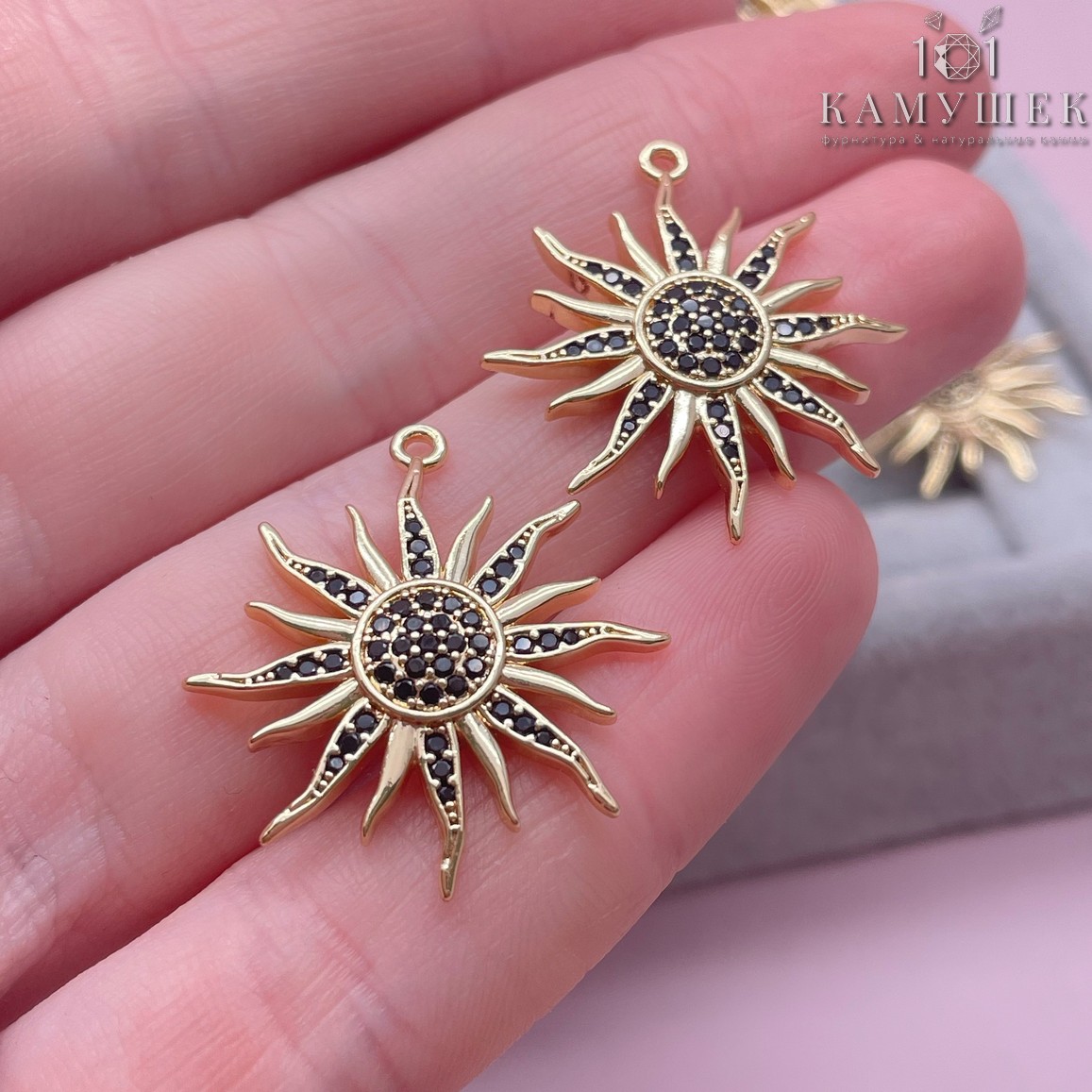 Подвеска солнце с черными цирконами, цвет золото 27х25 мм