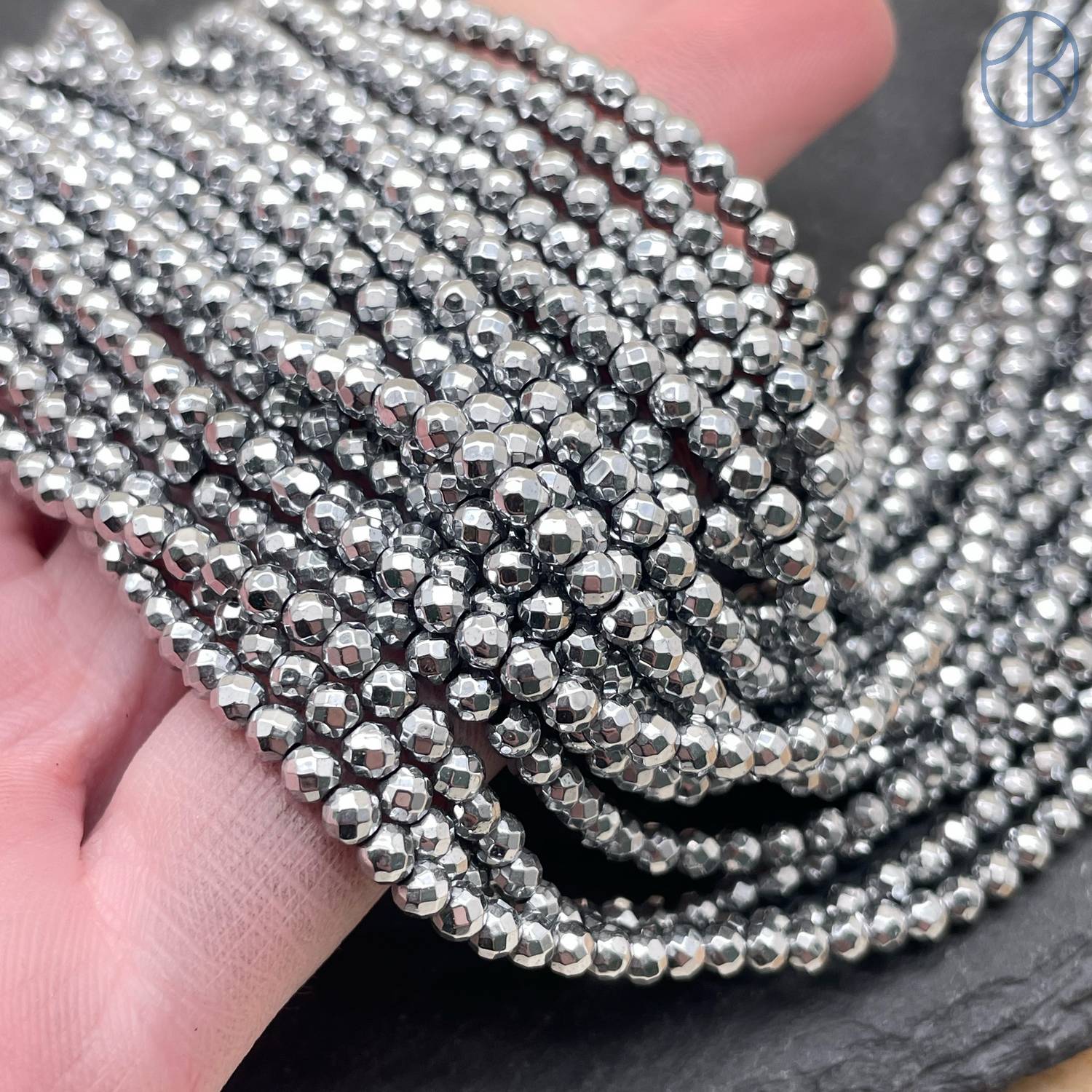 3 мм, Гематин имитация огранка круглая темное серебро