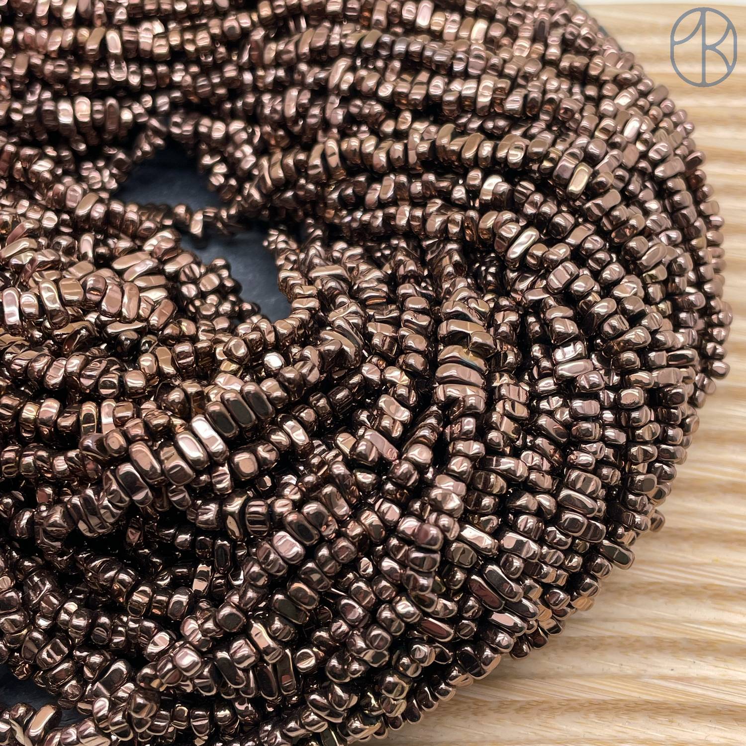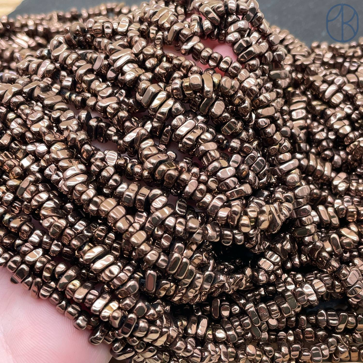 Гематин обладает гладкой, зеркальной поверхностью. Это свойство делает его очень привлекательным, но в то же время делает его более уязвимым к появлению мелких царапин. Во время транспортировки или при обработке бусин небольшие царапины могут появиться на их поверхности. Эти царапины обычно минимальны и едва заметны, но они могут быть видны при определенном освещении или под увеличением.