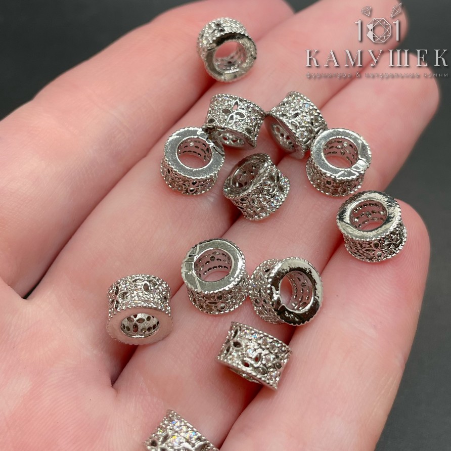 Бусина рондель цирконы, цвет серебро 10х6 мм