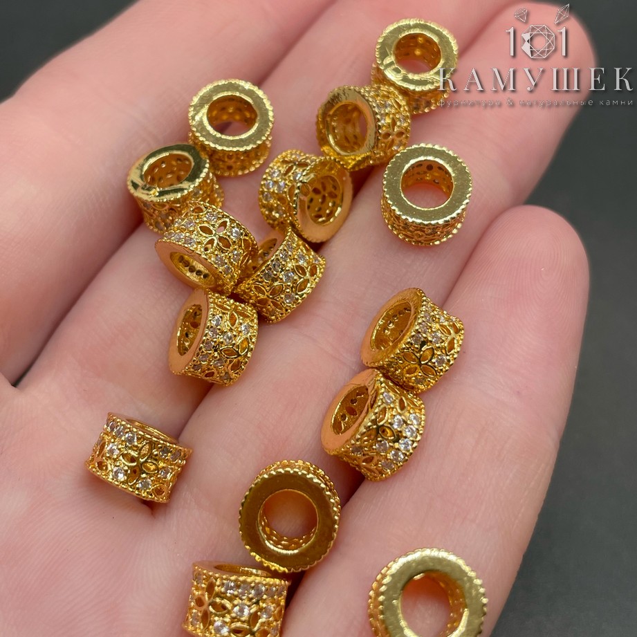 Бусина рондель цирконы, цвет золото 10х6 мм