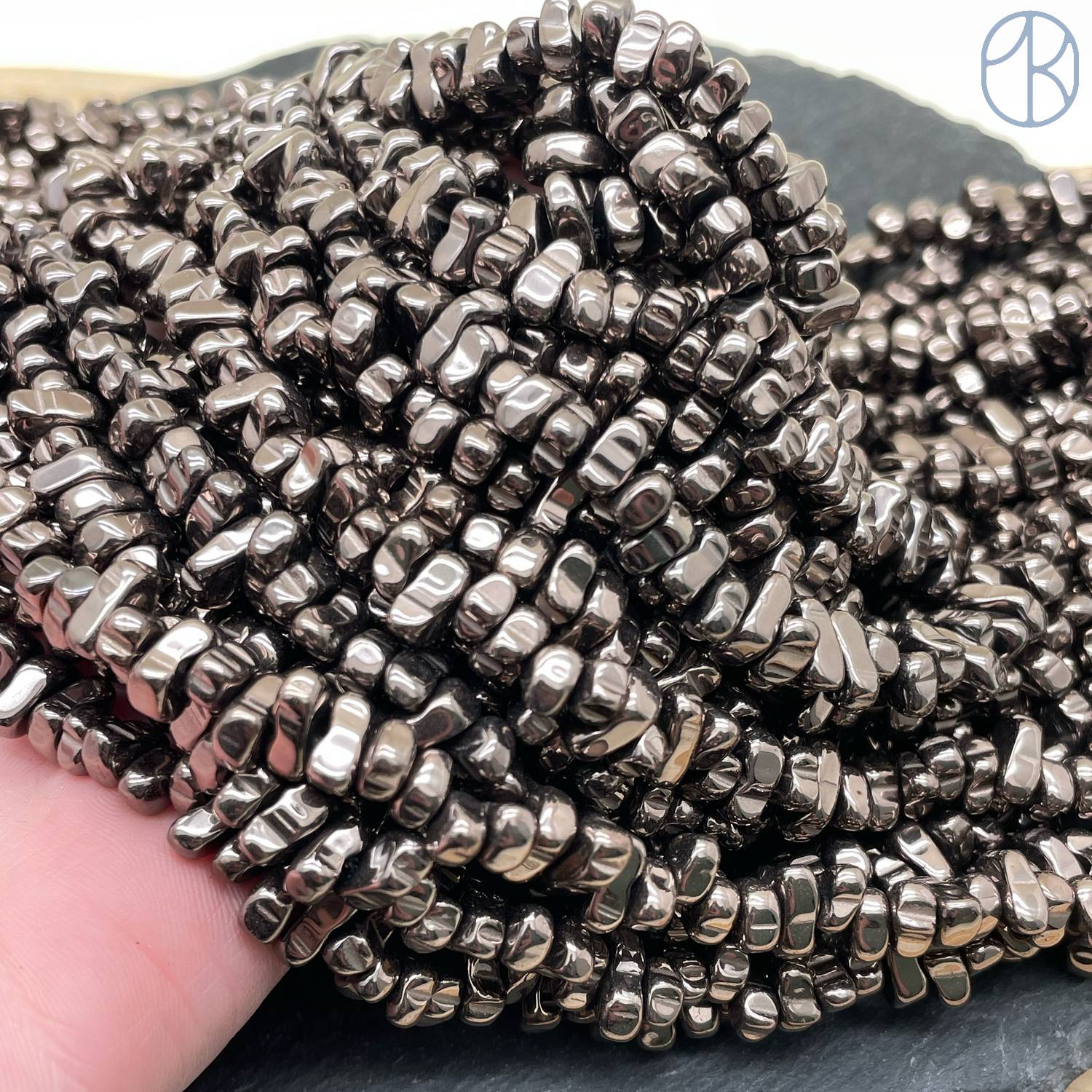Гематин обладает гладкой, зеркальной поверхностью. Это свойство делает его очень привлекательным, но в то же время делает его более уязвимым к появлению мелких царапин. Во время транспортировки или при обработке бусин небольшие царапины могут появиться на их поверхности. Эти царапины обычно минимальны и едва заметны, но они могут быть видны при определенном освещении или под увеличением.