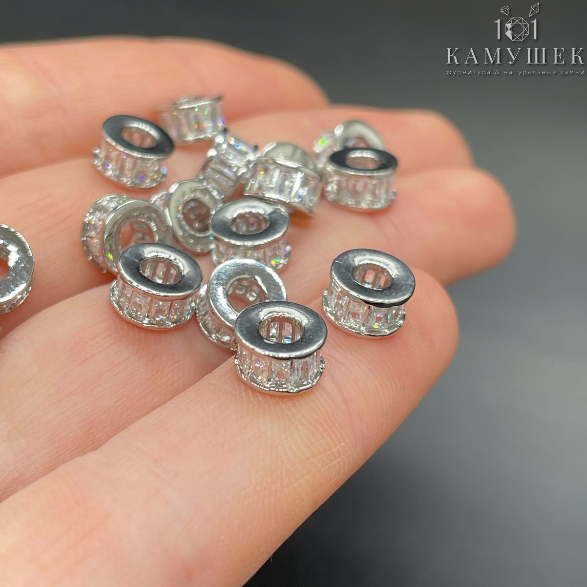 Бусина рондель цирконы, цвет серебро 7х4 мм