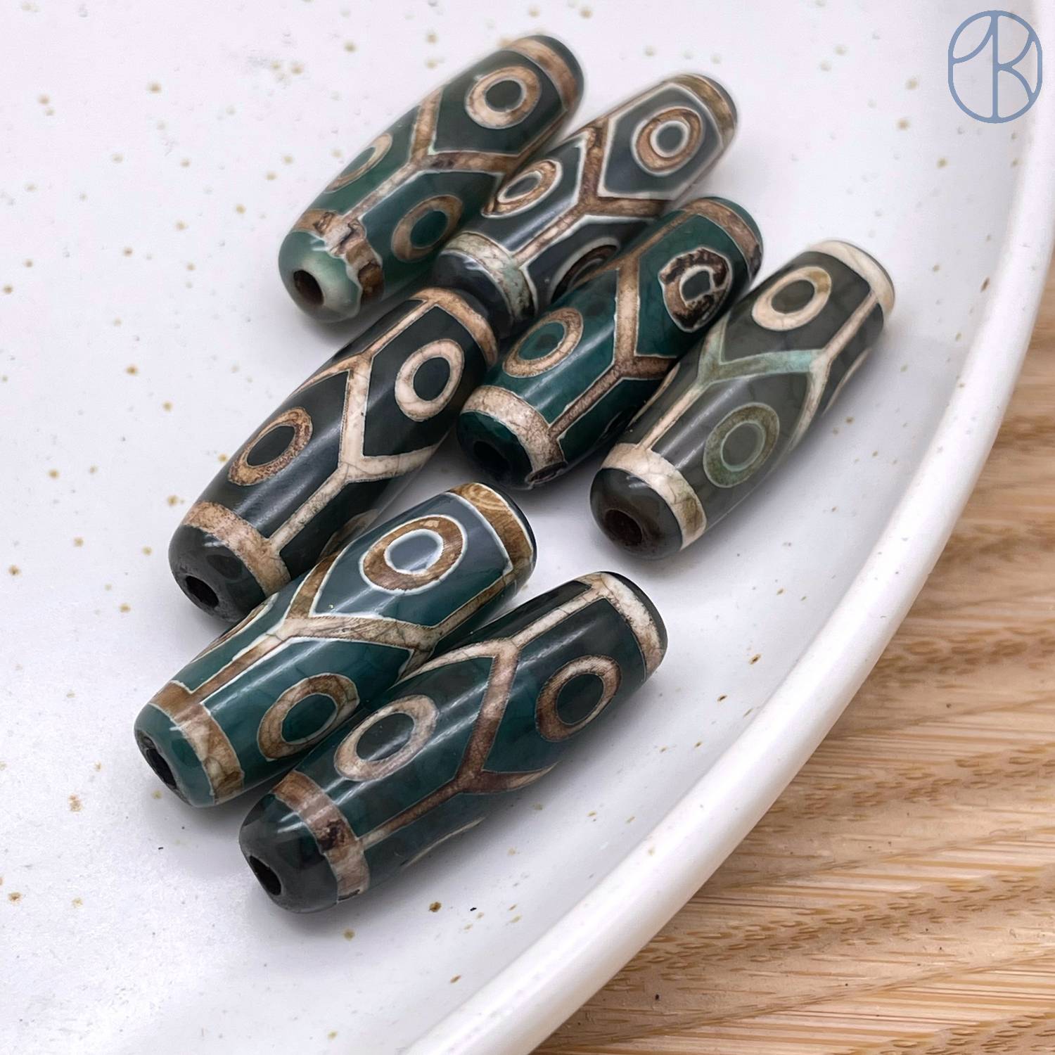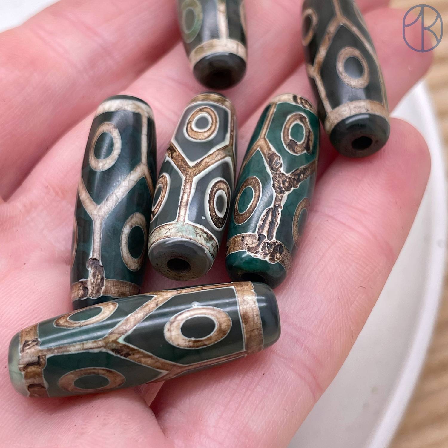 Бусина Дзи 6 глаз и черепаший панцирь серо-зеленый бочонок 30х11 мм