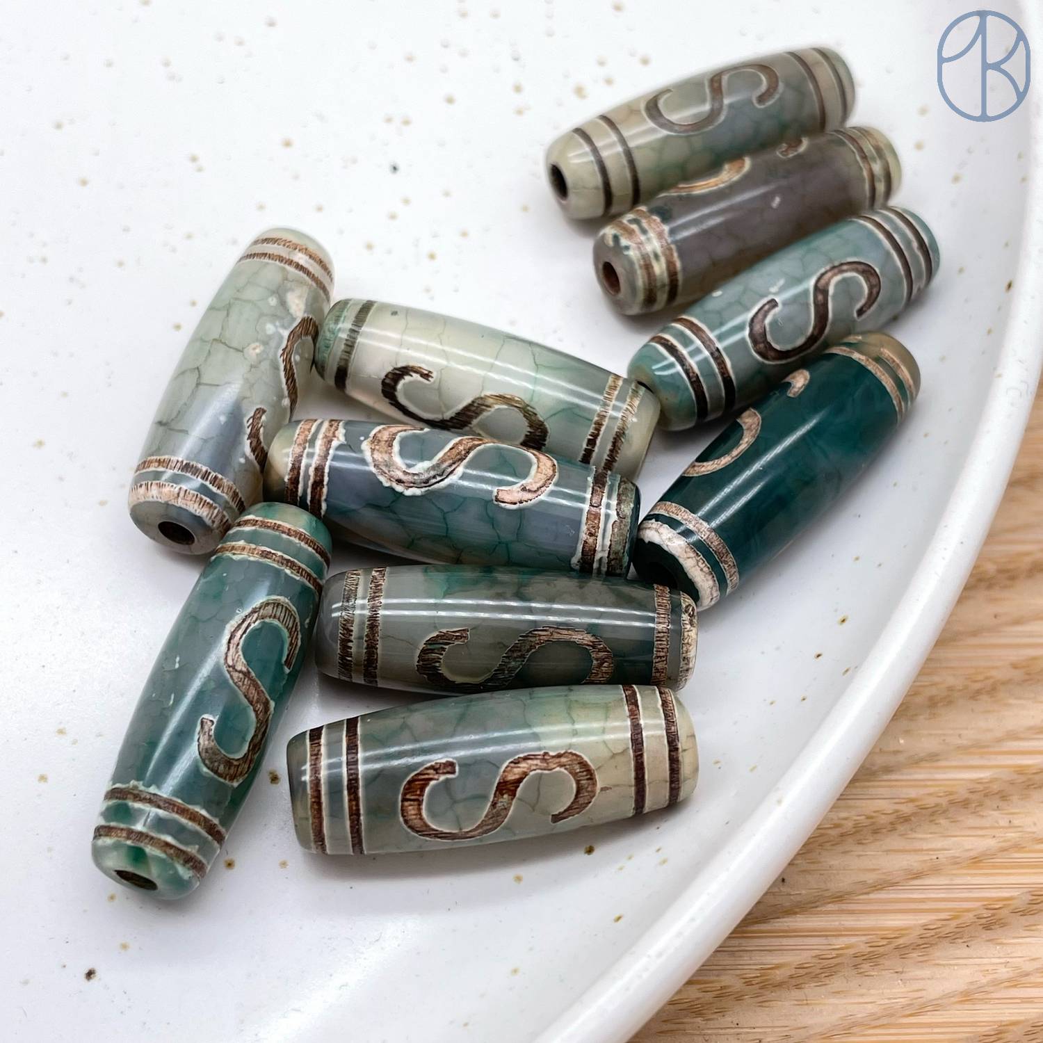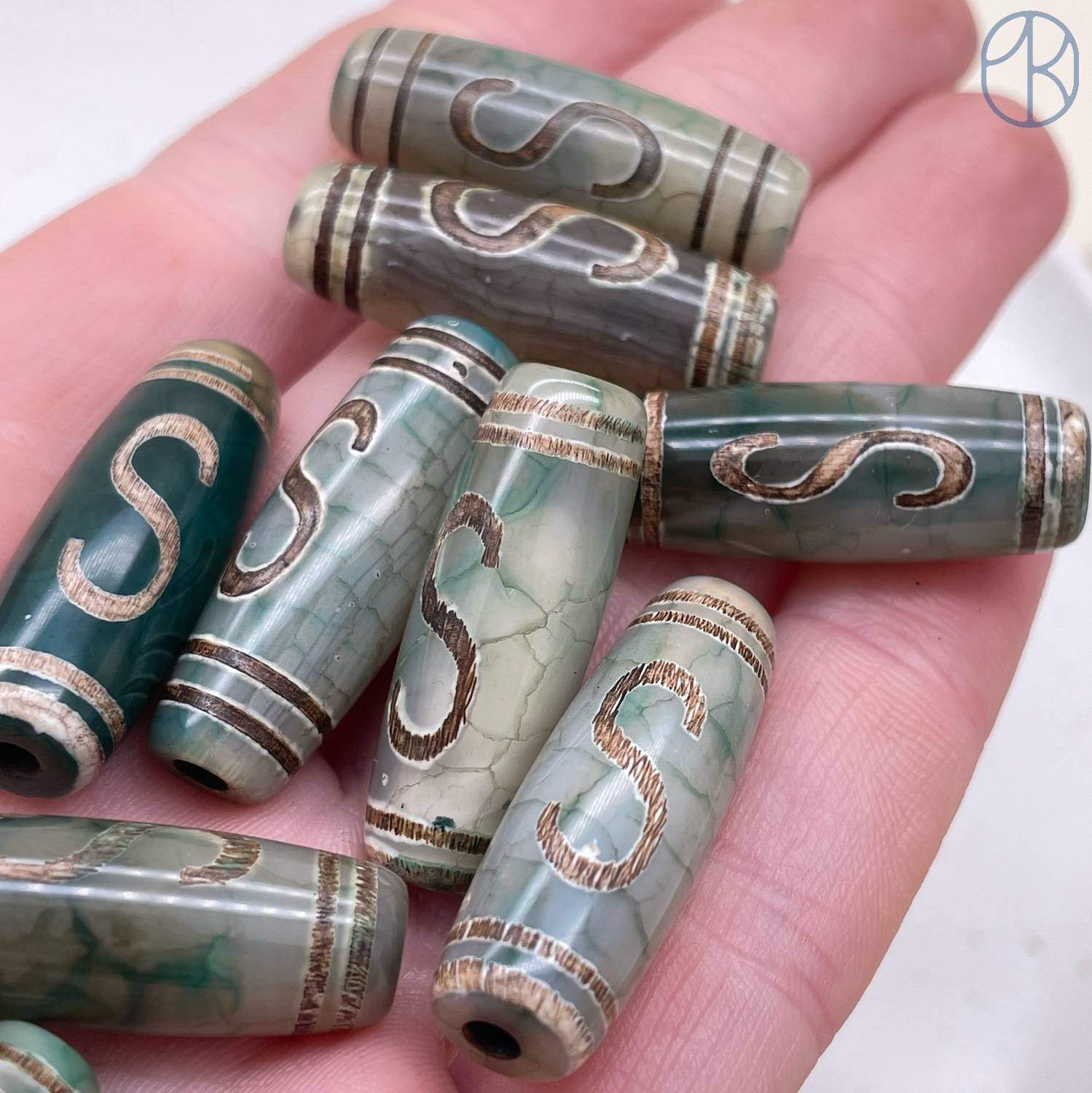 Бусина Дзи Денежный крючок серо-зеленый бочонок 30х11 мм