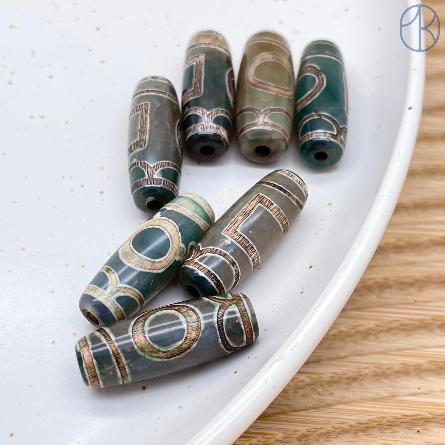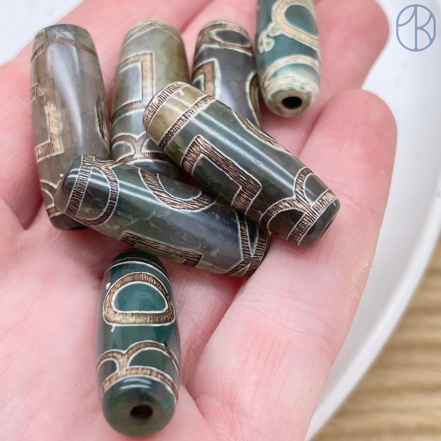 Бусина Дзи Небо и Земля серо-зеленый бочонок 30х11 мм