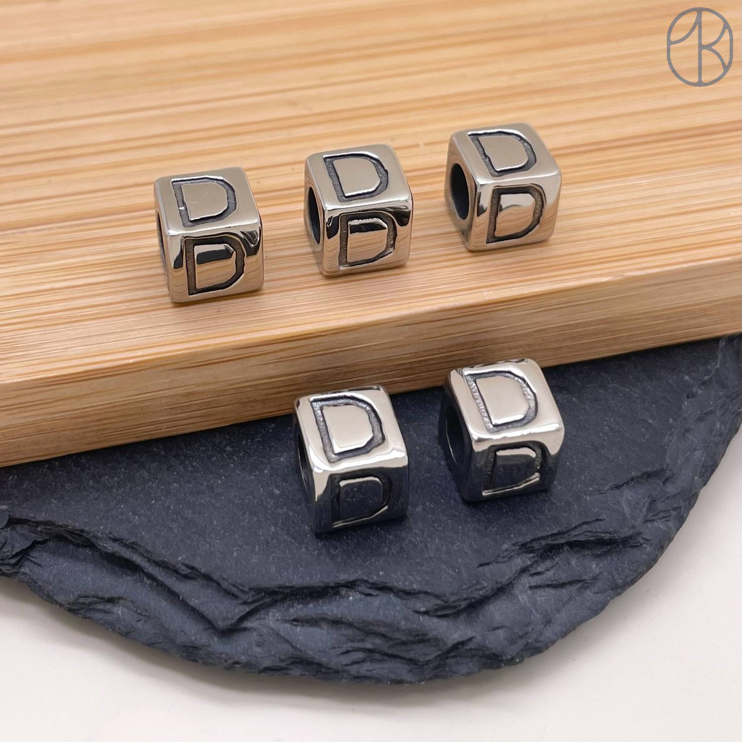 Бусина сталь куб буква D, цвет серебро 8 мм
