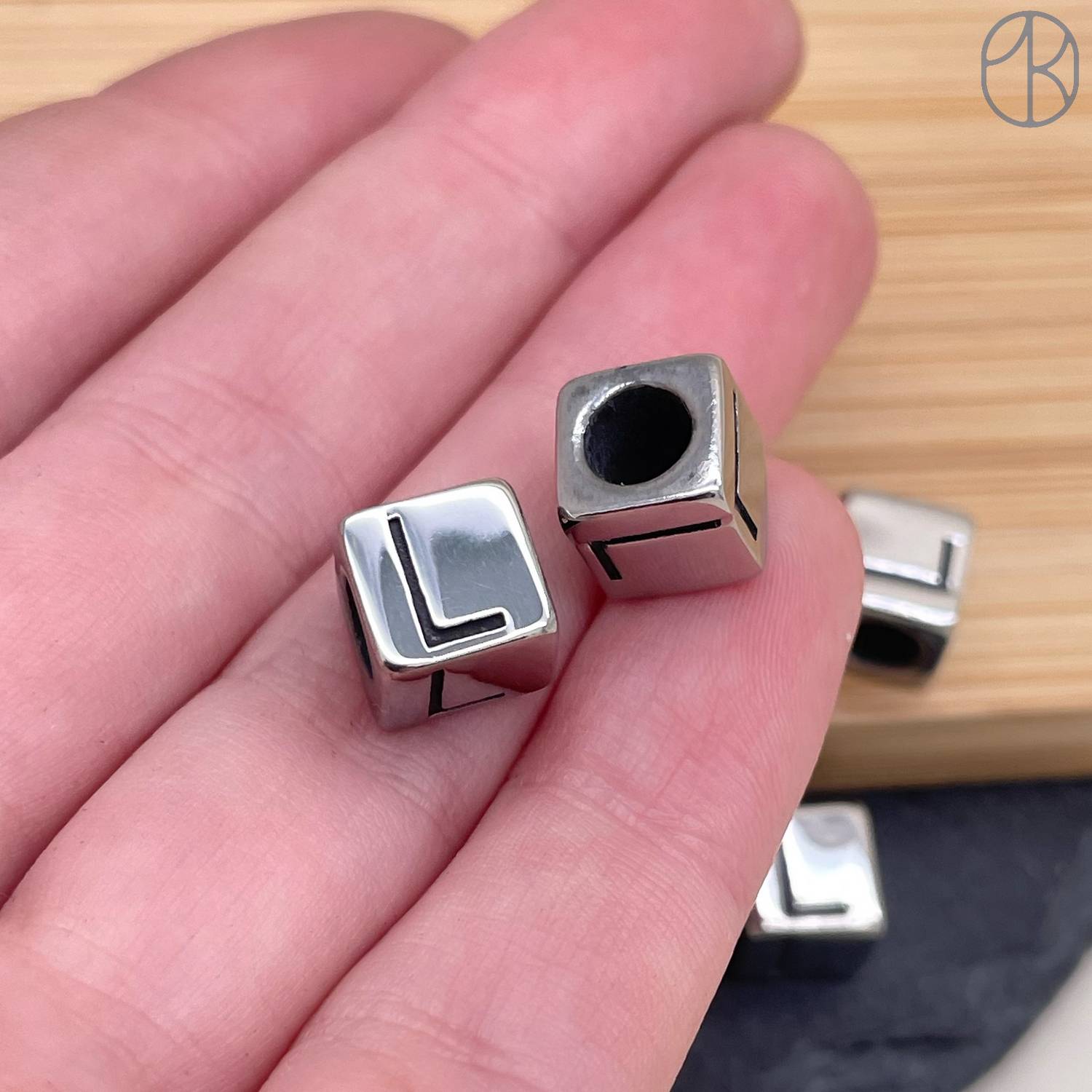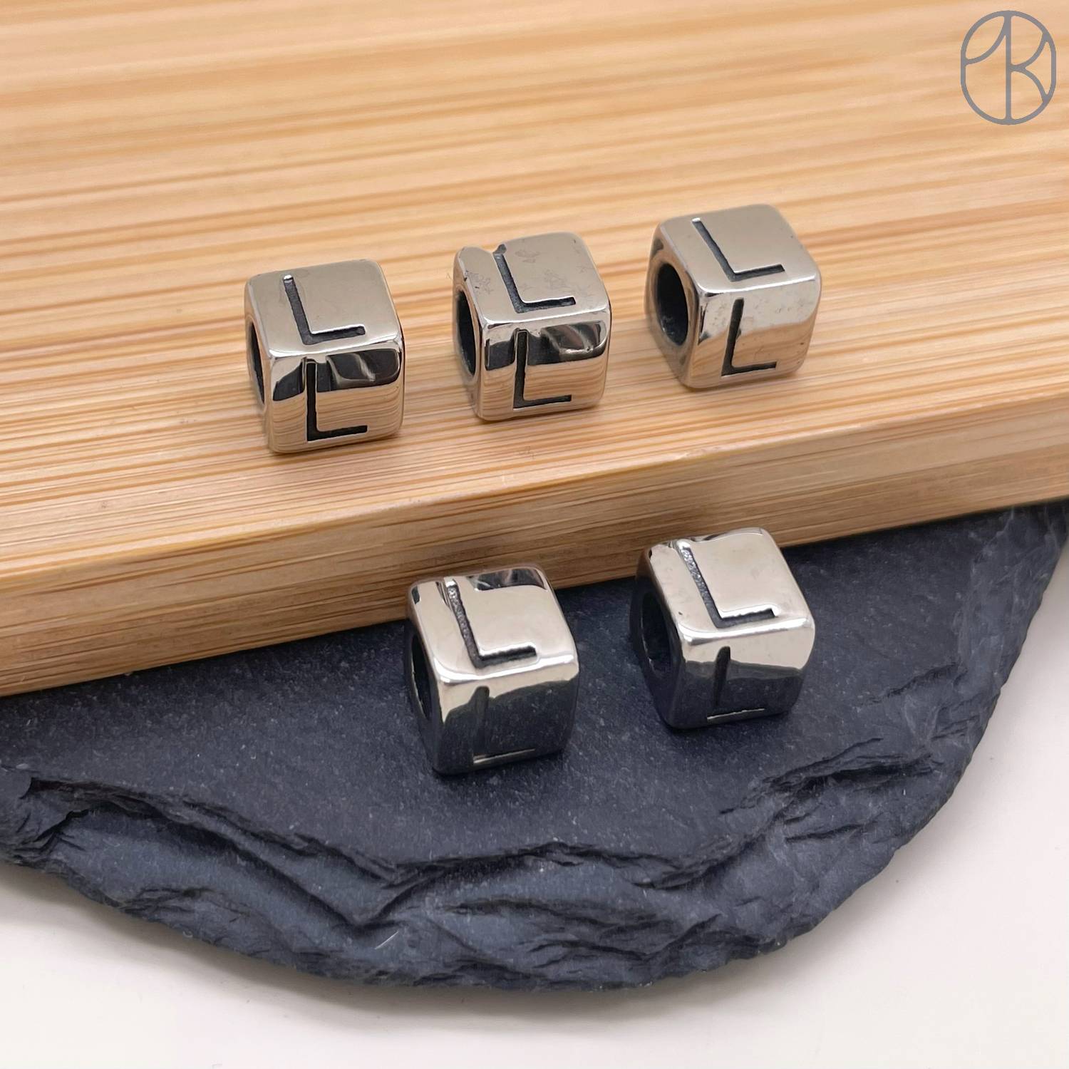 Бусина сталь куб буква L, цвет серебро 8 мм