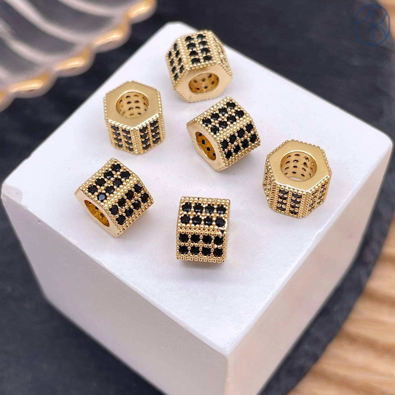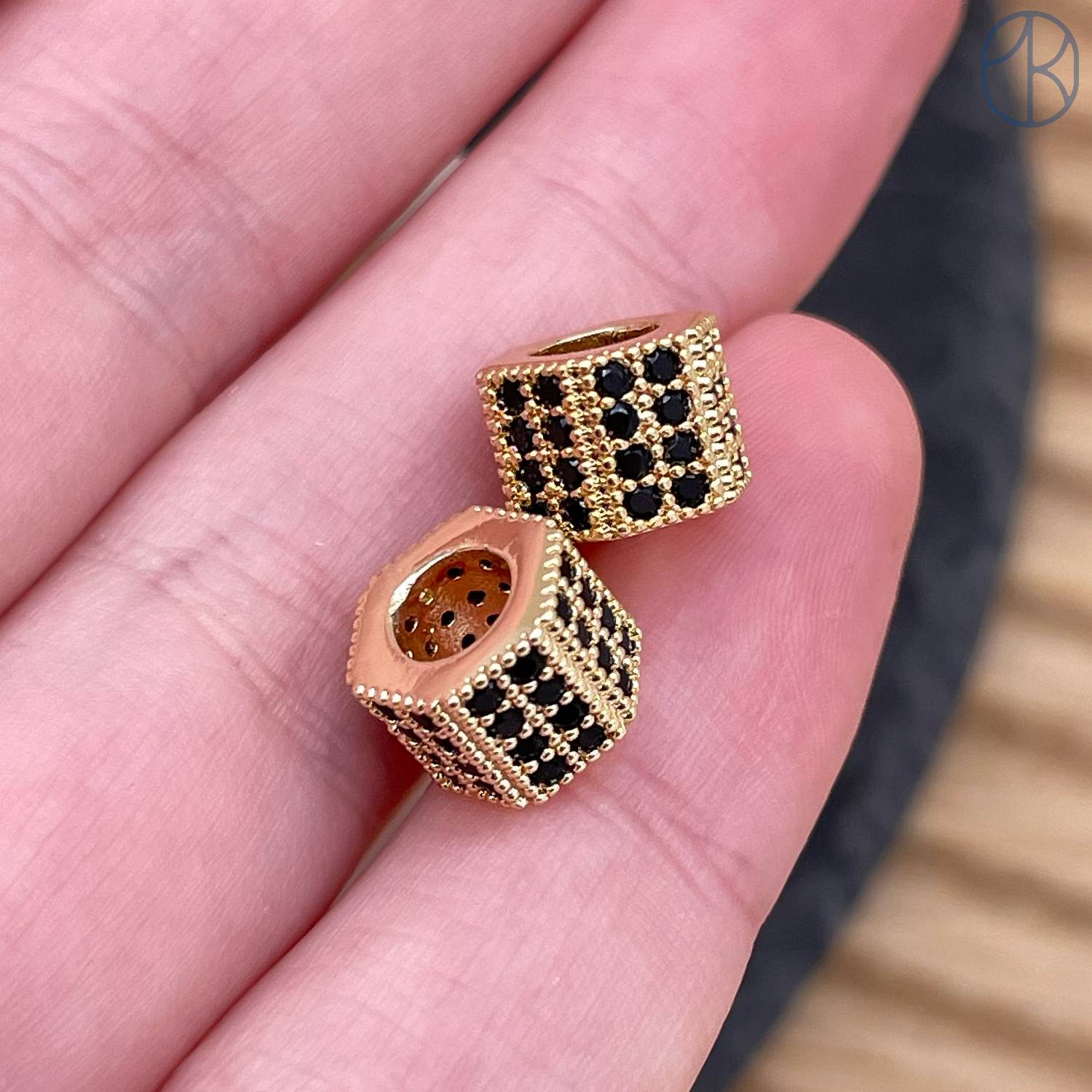 Бусина цилиндр черные цирконы, цвет золото 6х8 мм