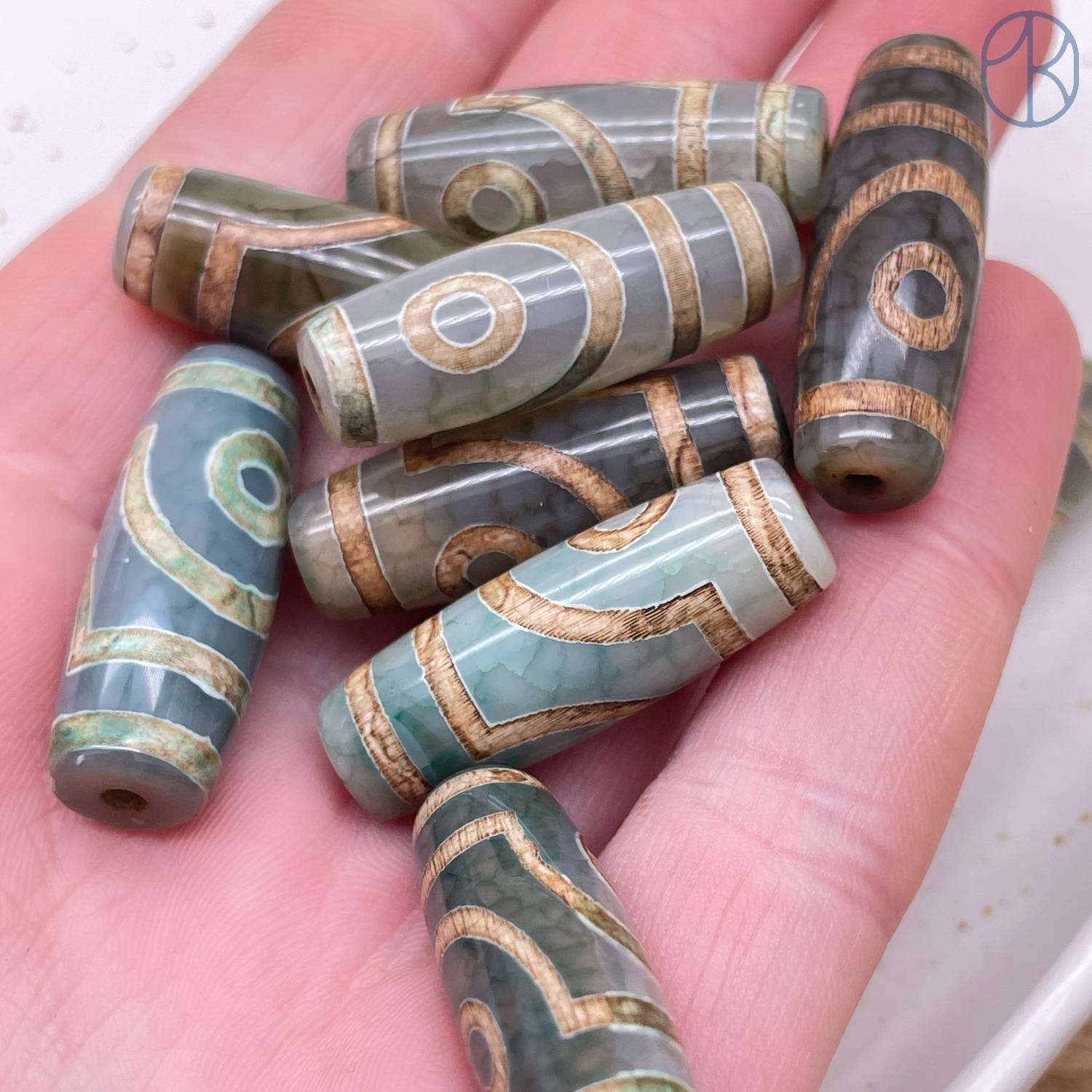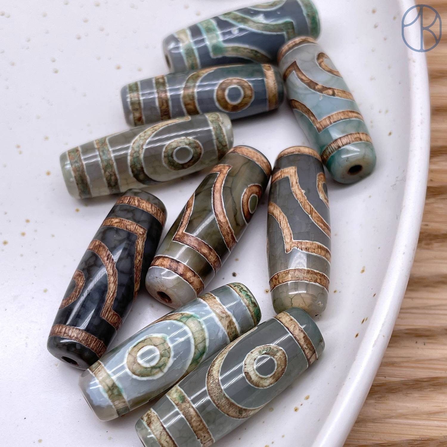 Бусина Дзи 2 глаза серо-зеленый бочонок 30х11 мм