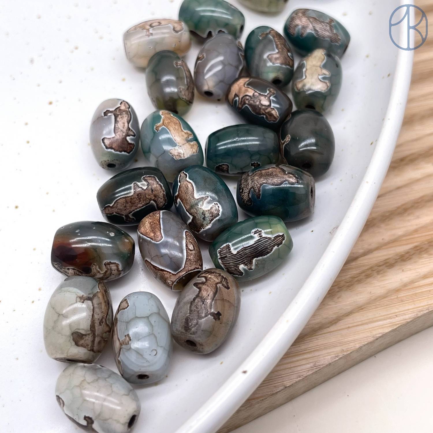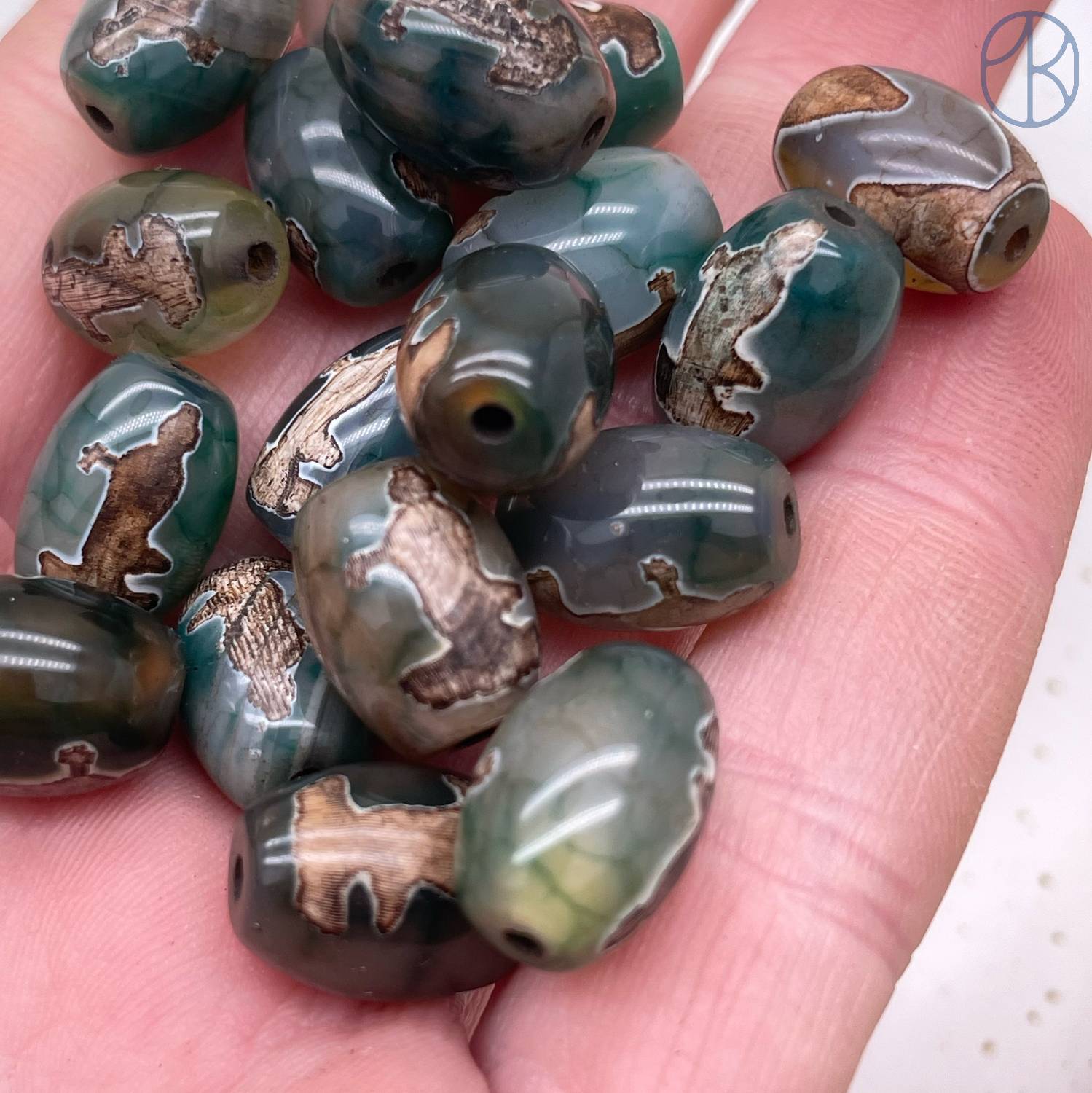 Бусина Дзи Гуань Инь зелено-коричневый бочонок уп. 5шт 14х10 мм