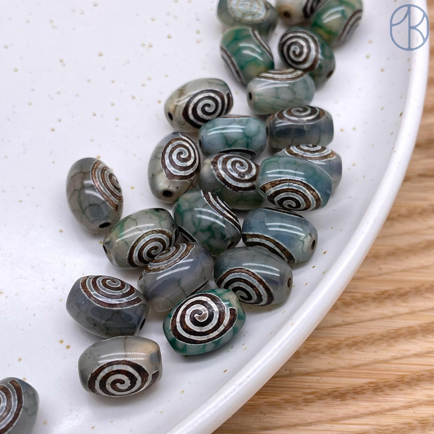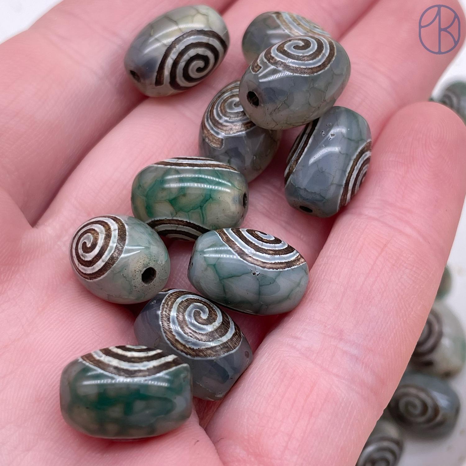 Бусина Дзи Спираль Вселенной серо-зеленый бочонок уп. 5 шт 14х10 мм