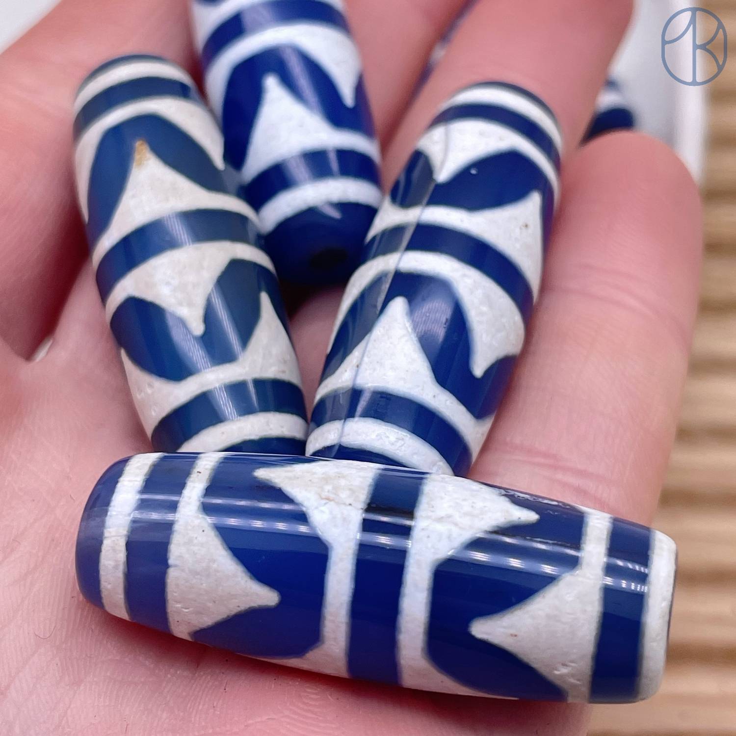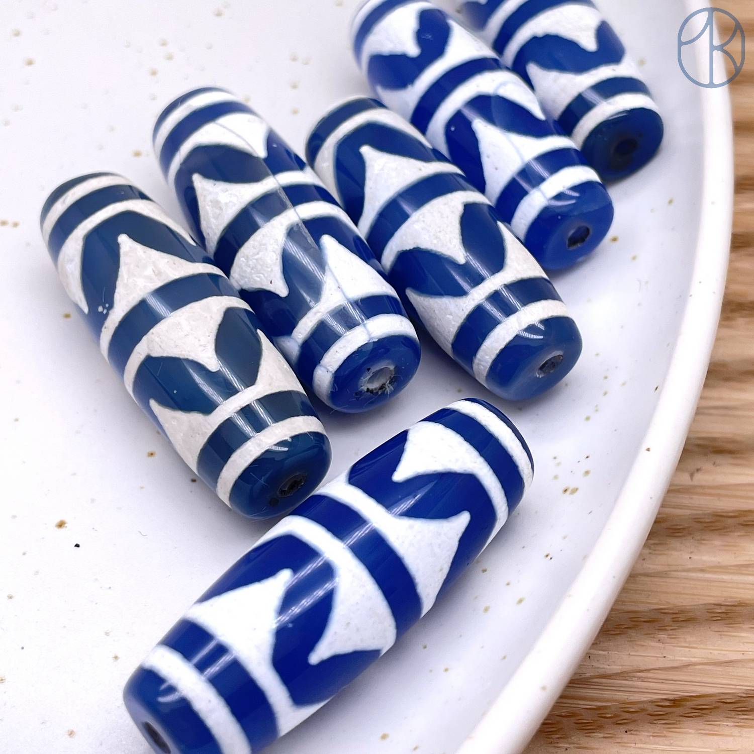Бусина Дзи 2-й тигриный клык бело-синий бочонок 40х14 мм