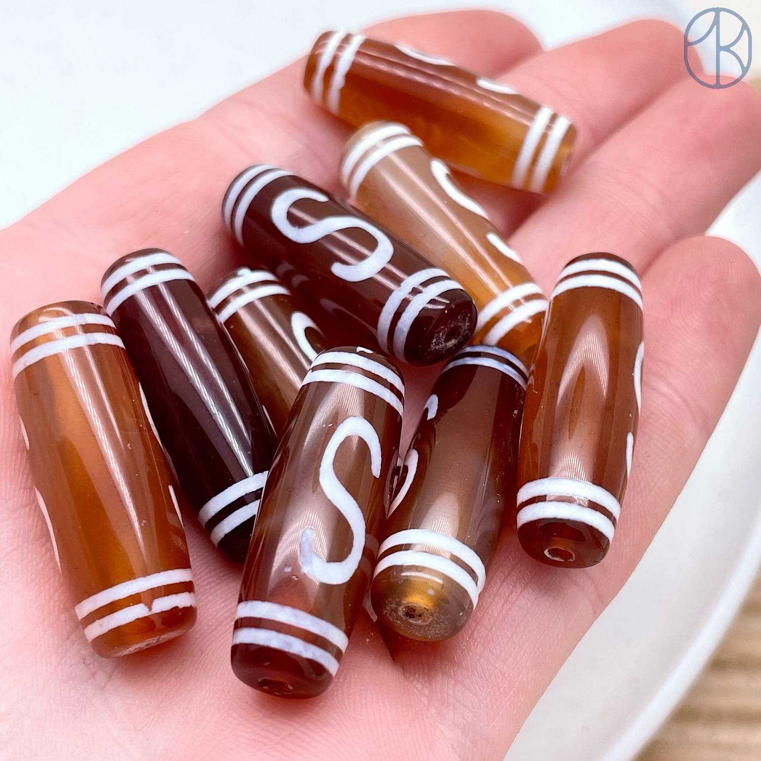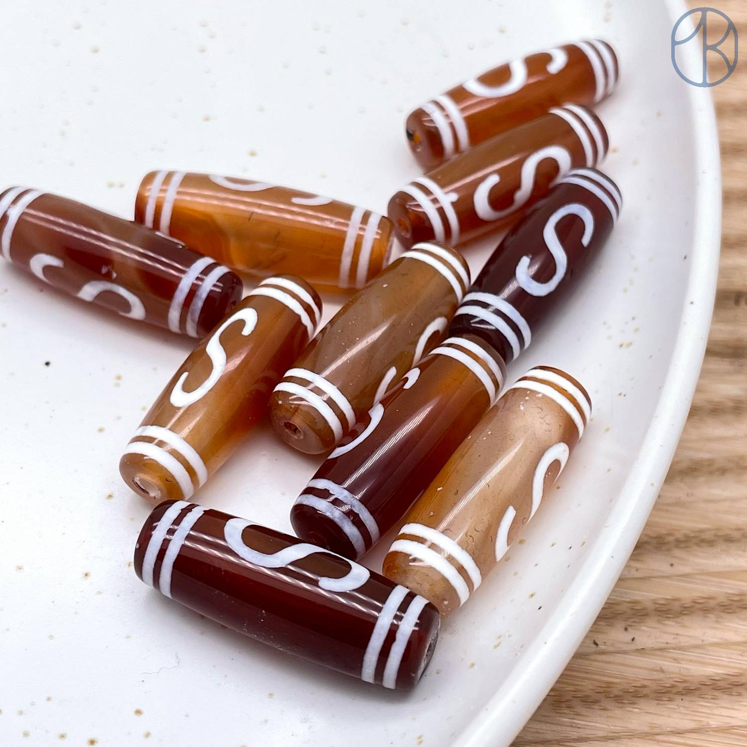 Бусина Дзи Денежный крючок коричнево-белый бочонок 30х11 мм