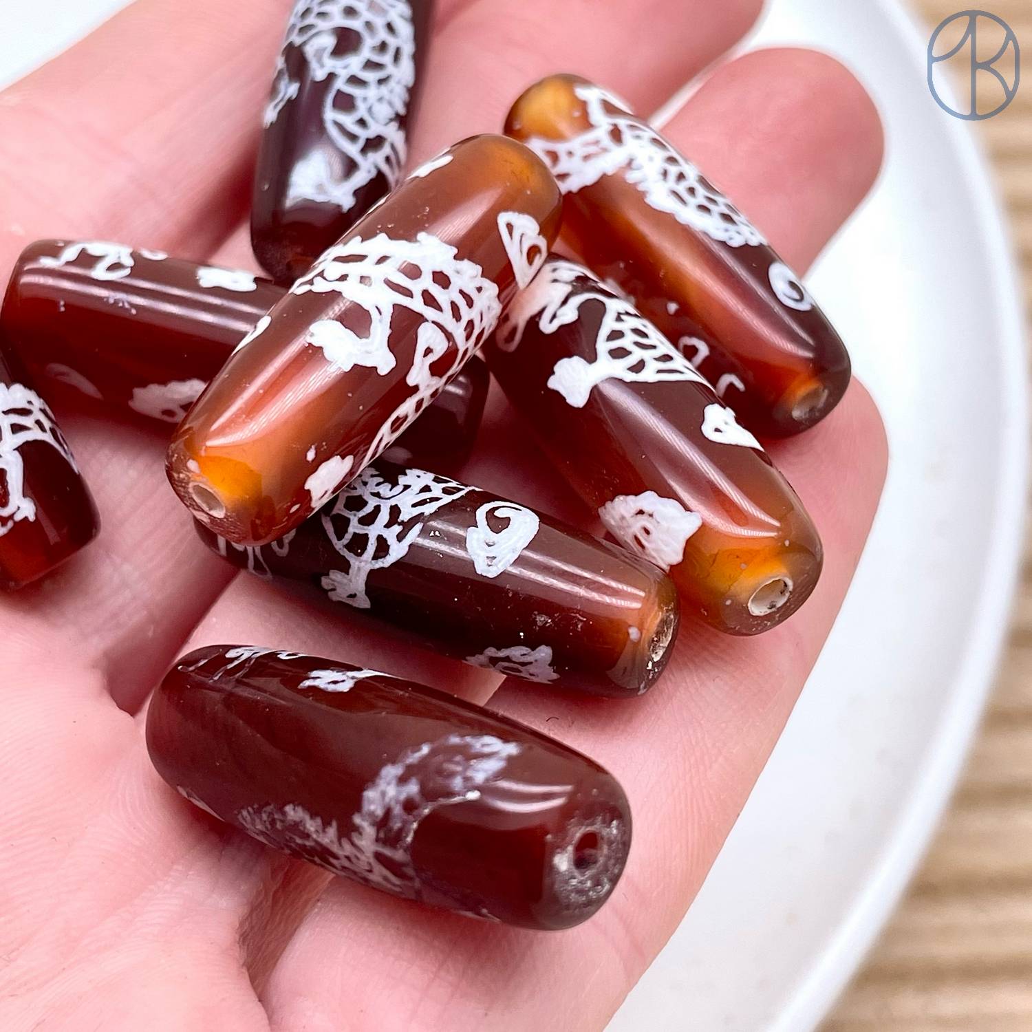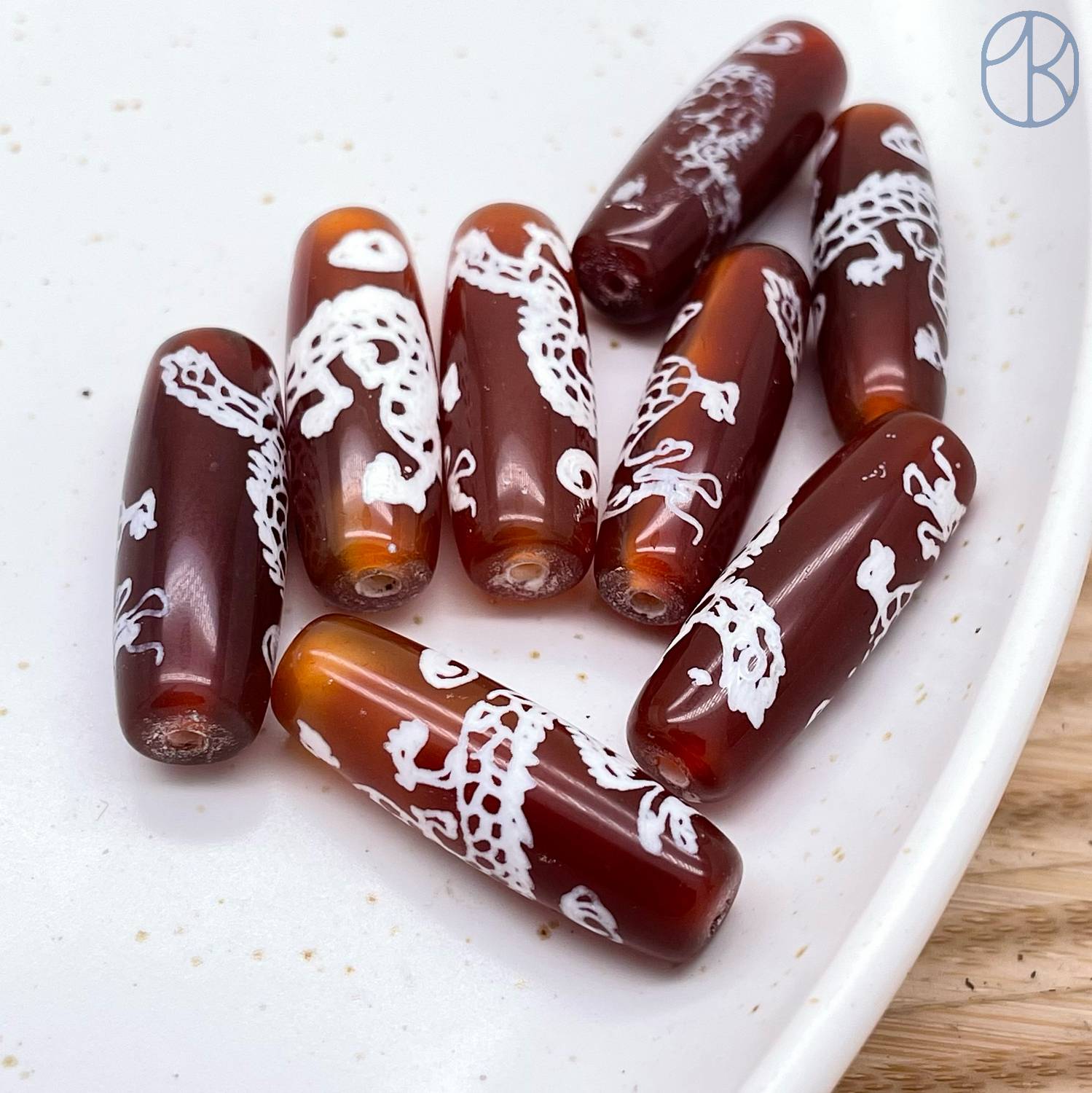 Бусина Дзи Дракон коричнево-белый бочонок 30х11 мм