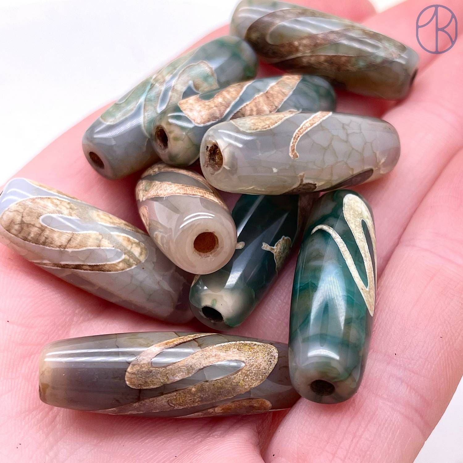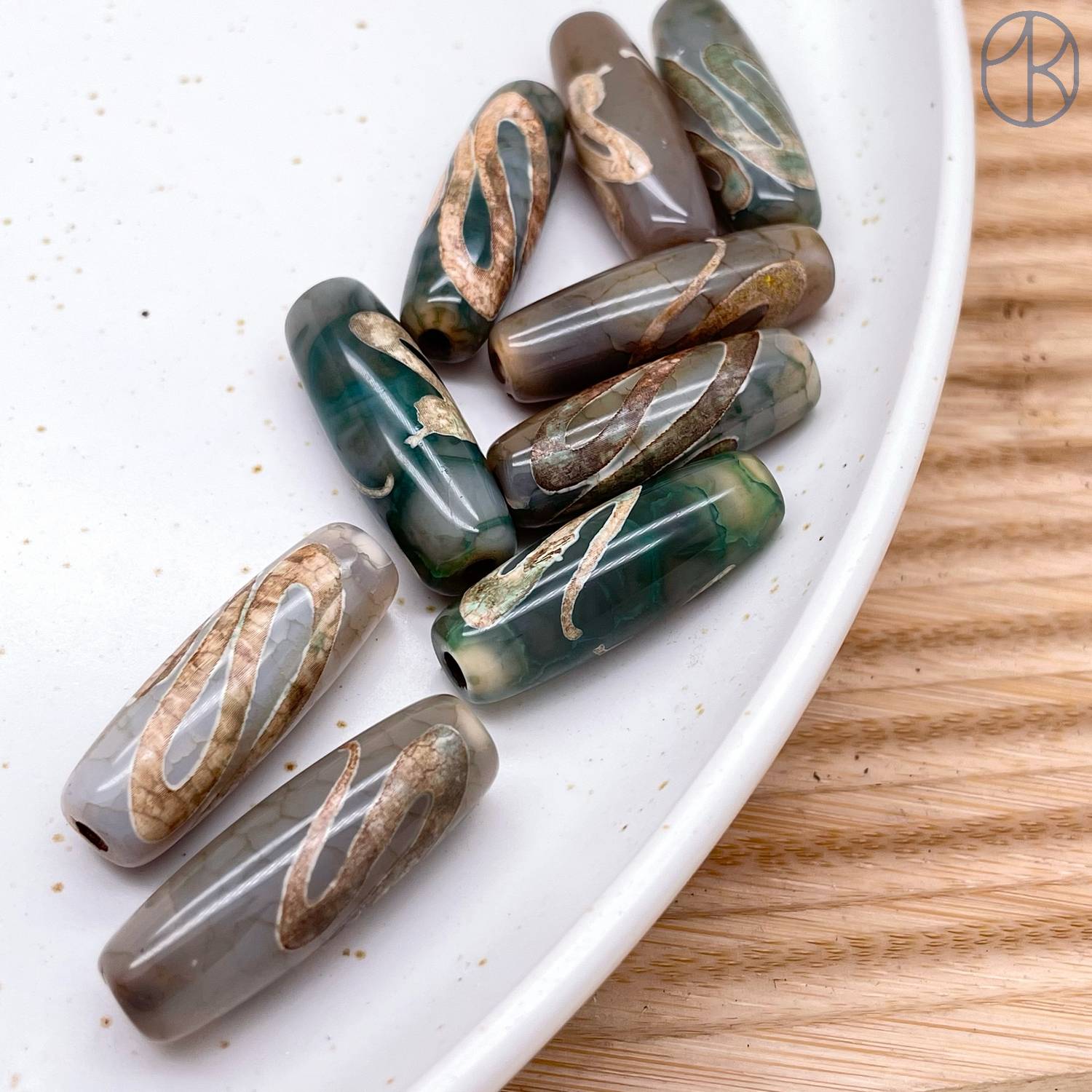 Бусина Дзи Змея серо-зеленый бочонок 30х11 мм