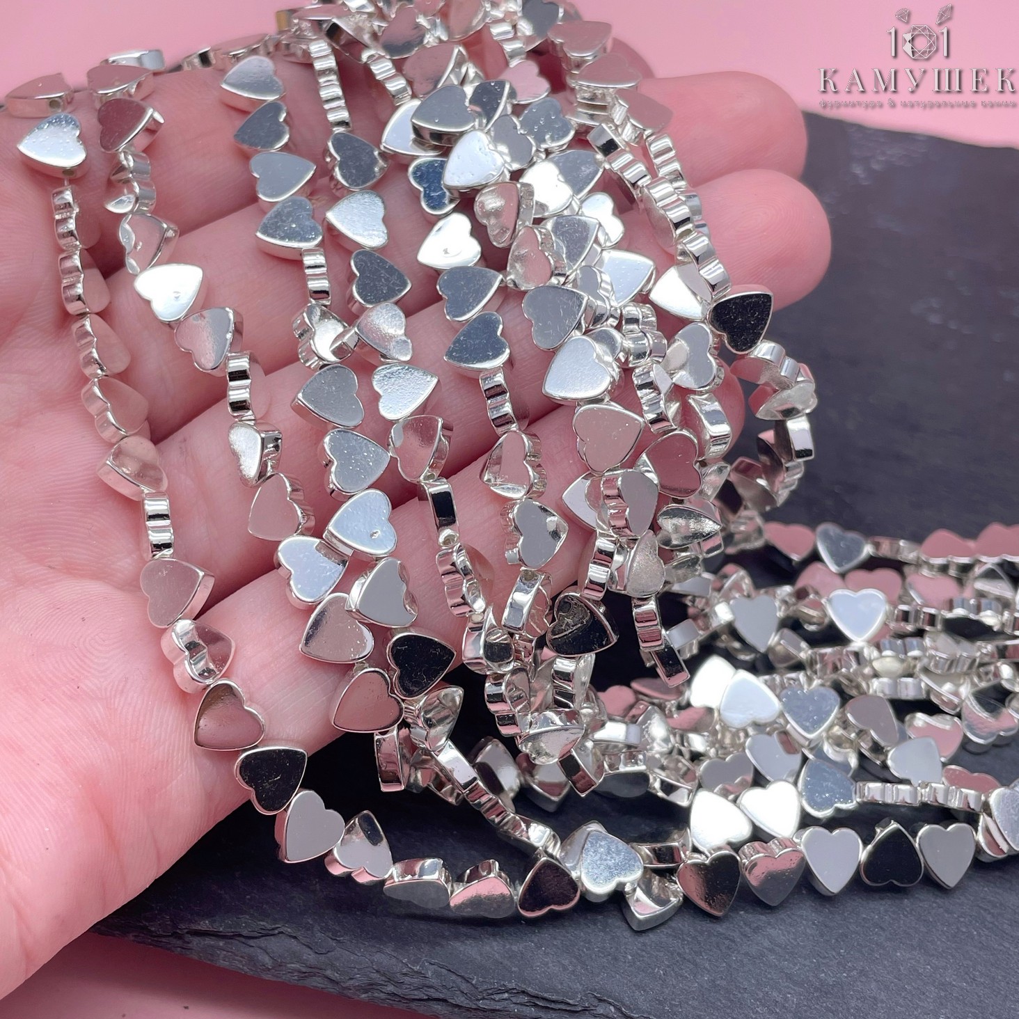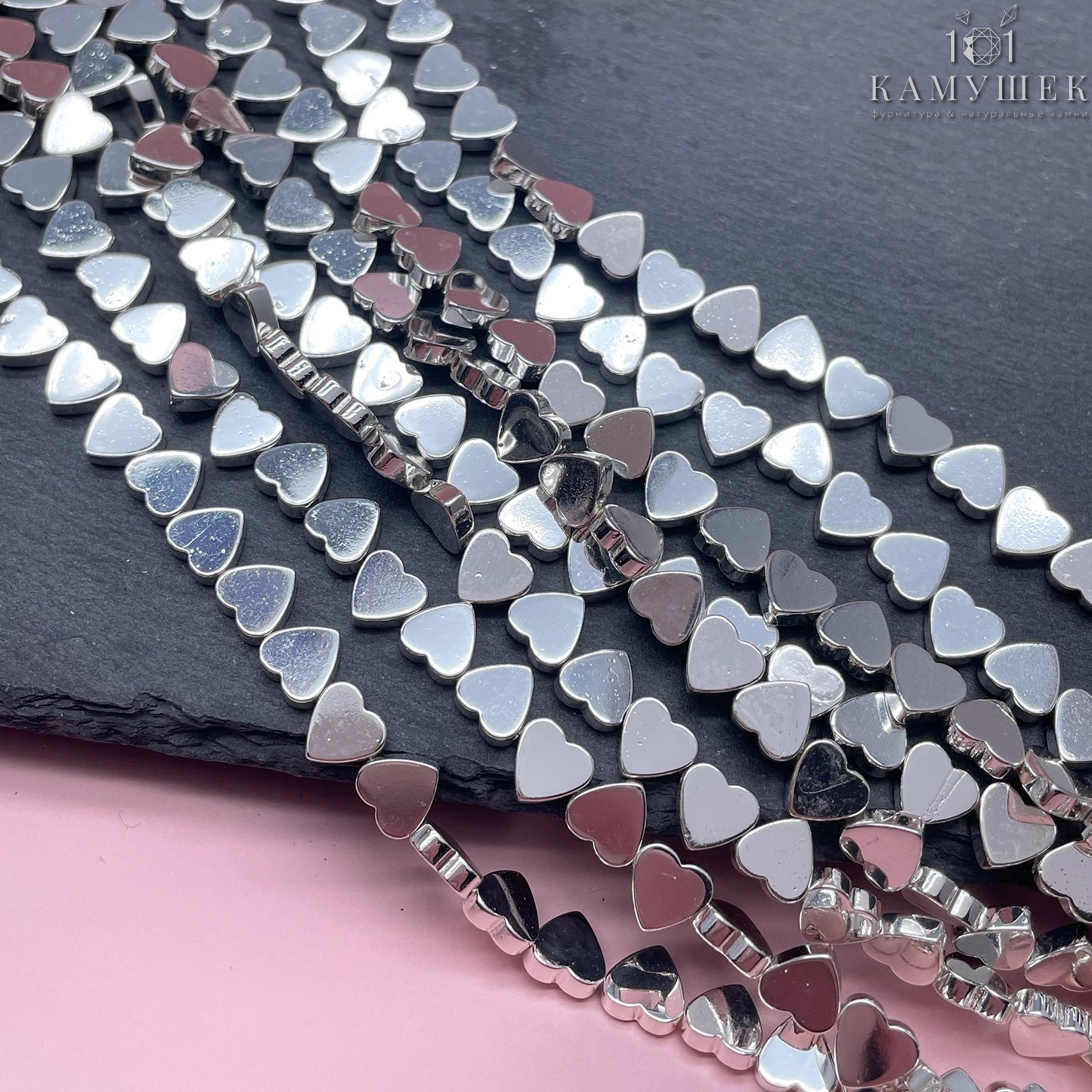 6 мм, Гематин имитация сердце поперек светлое серебро