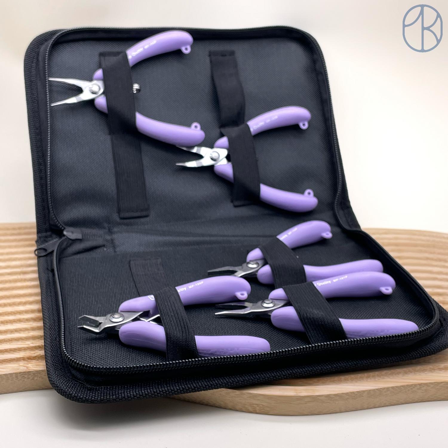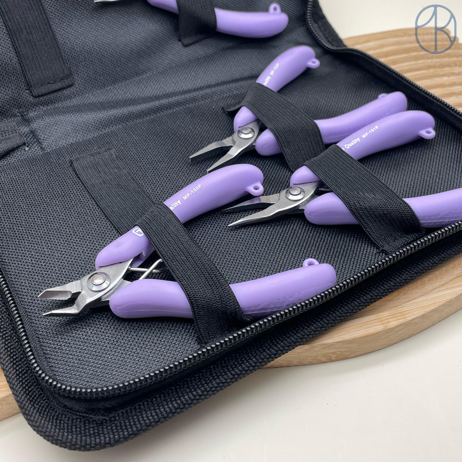 В набор входит: футляр, кусачки, плоскогубцы, утконосы, круглогубцы, тонкогубцы.