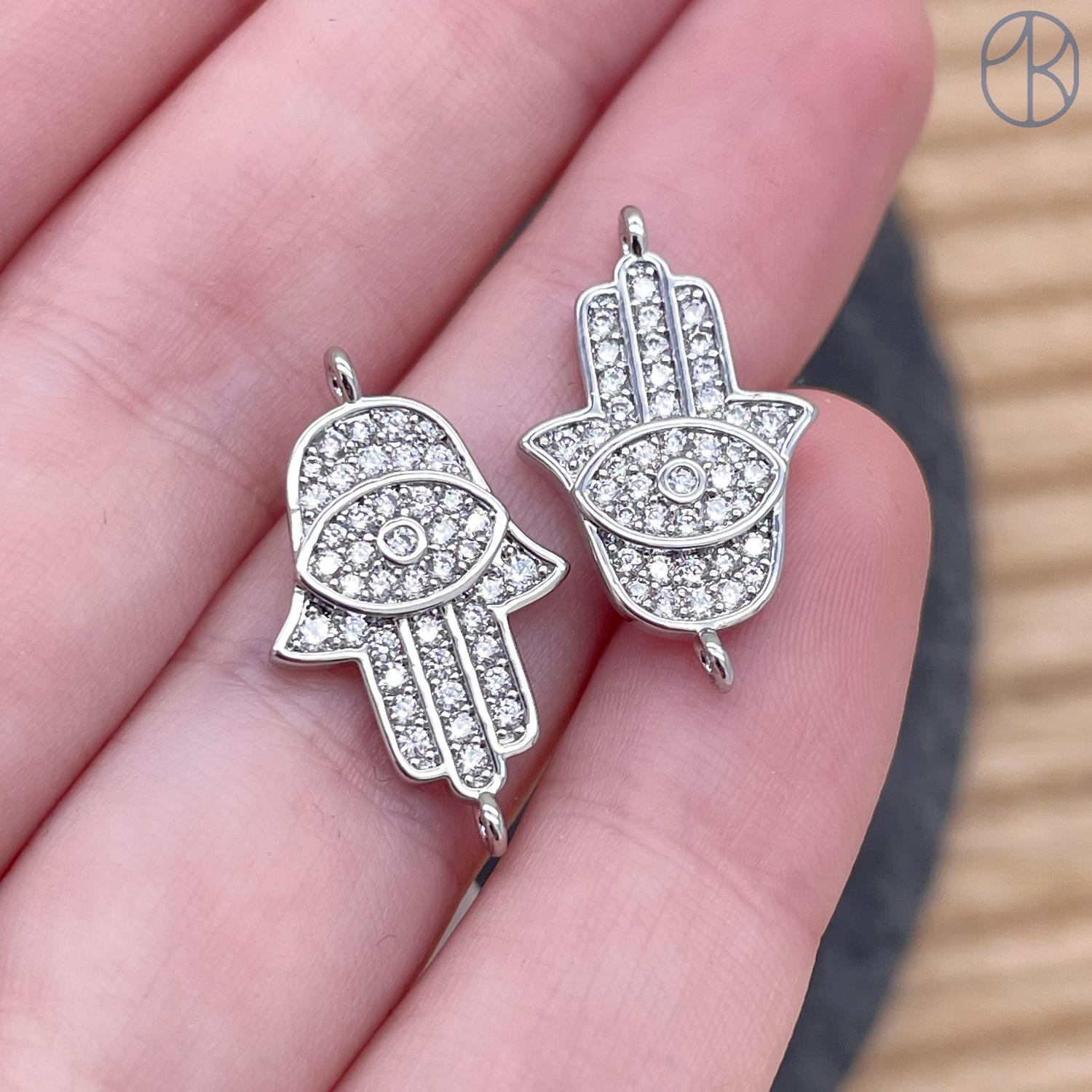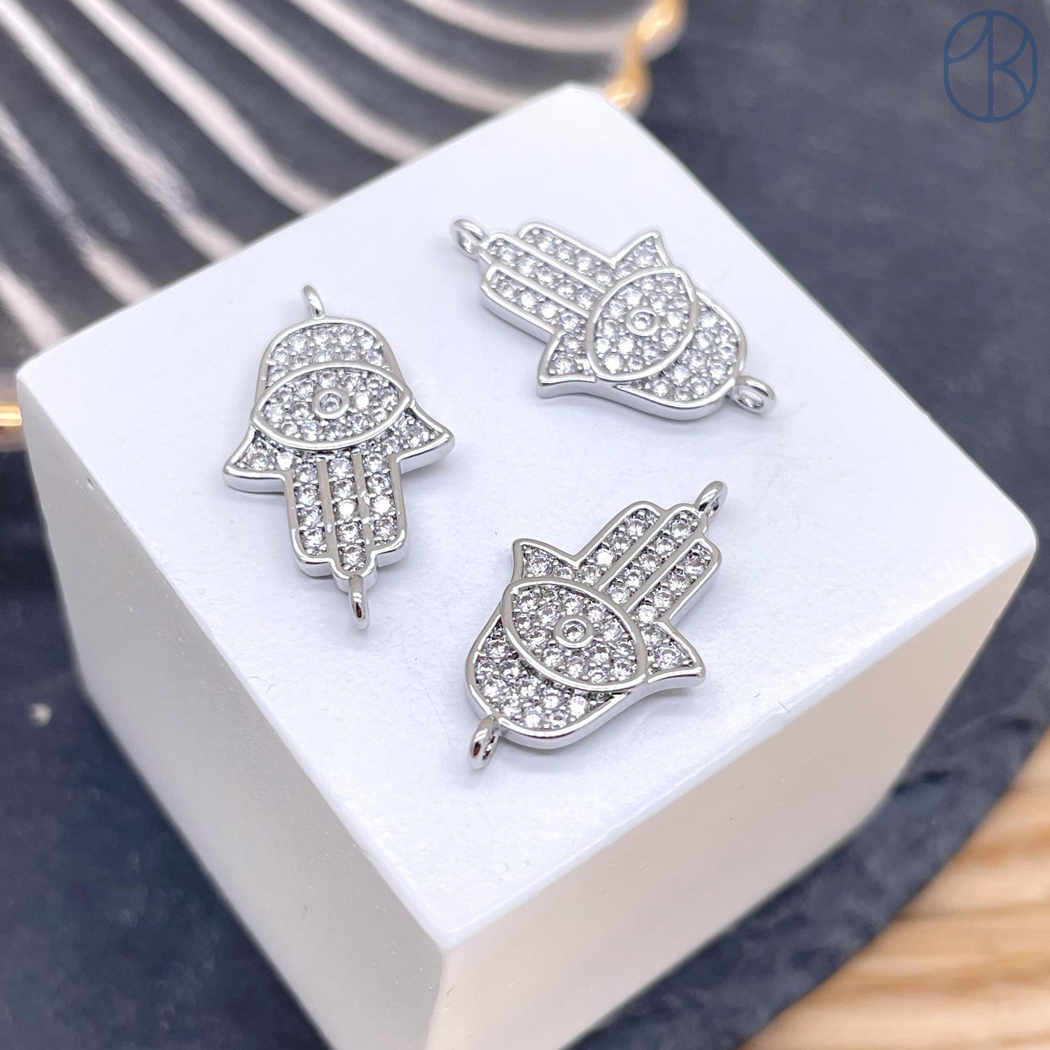 Коннектор рука Фатимы цирконы, цвет серебро 21х12 мм