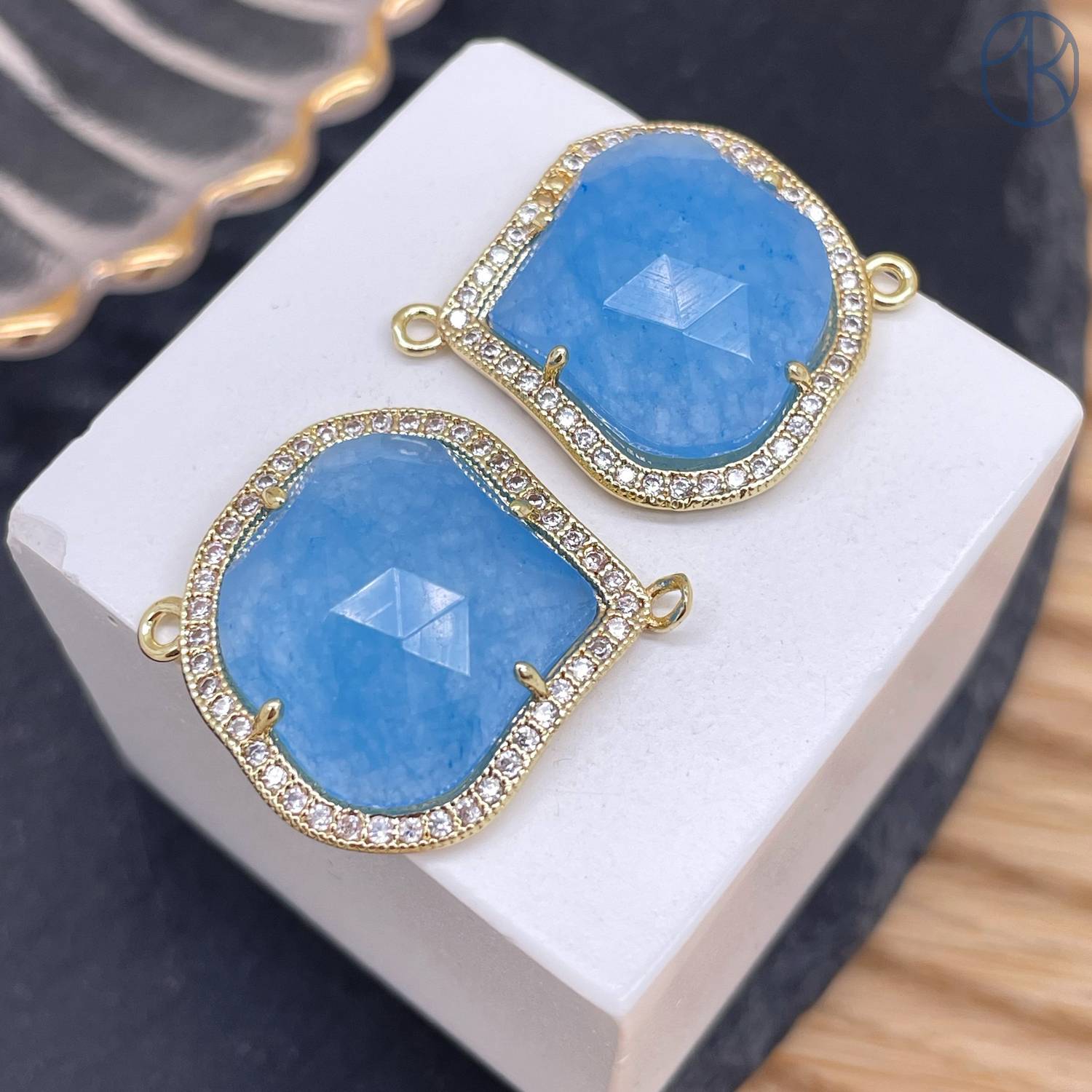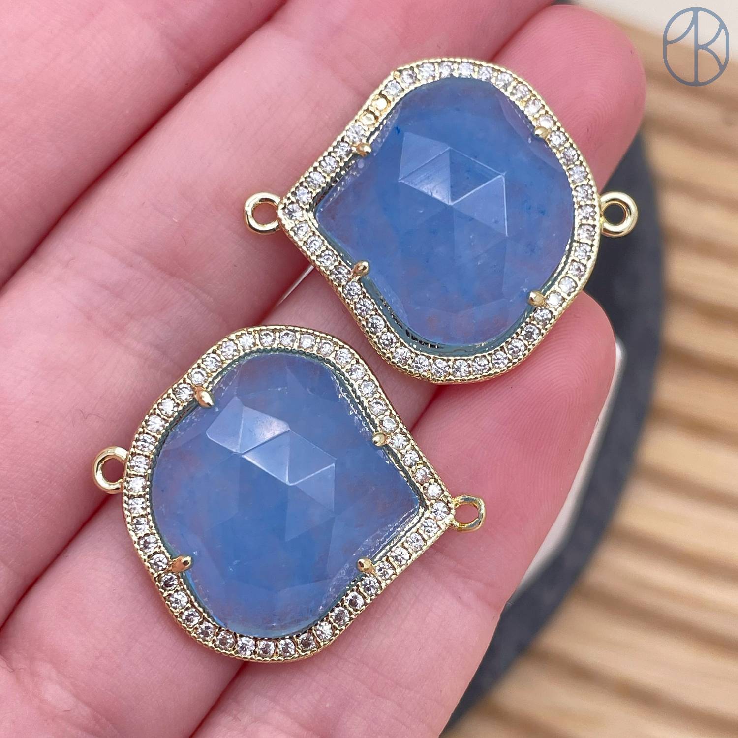 Коннектор огранка кварц голубой тонированный, цвет золото ~ 24 мм