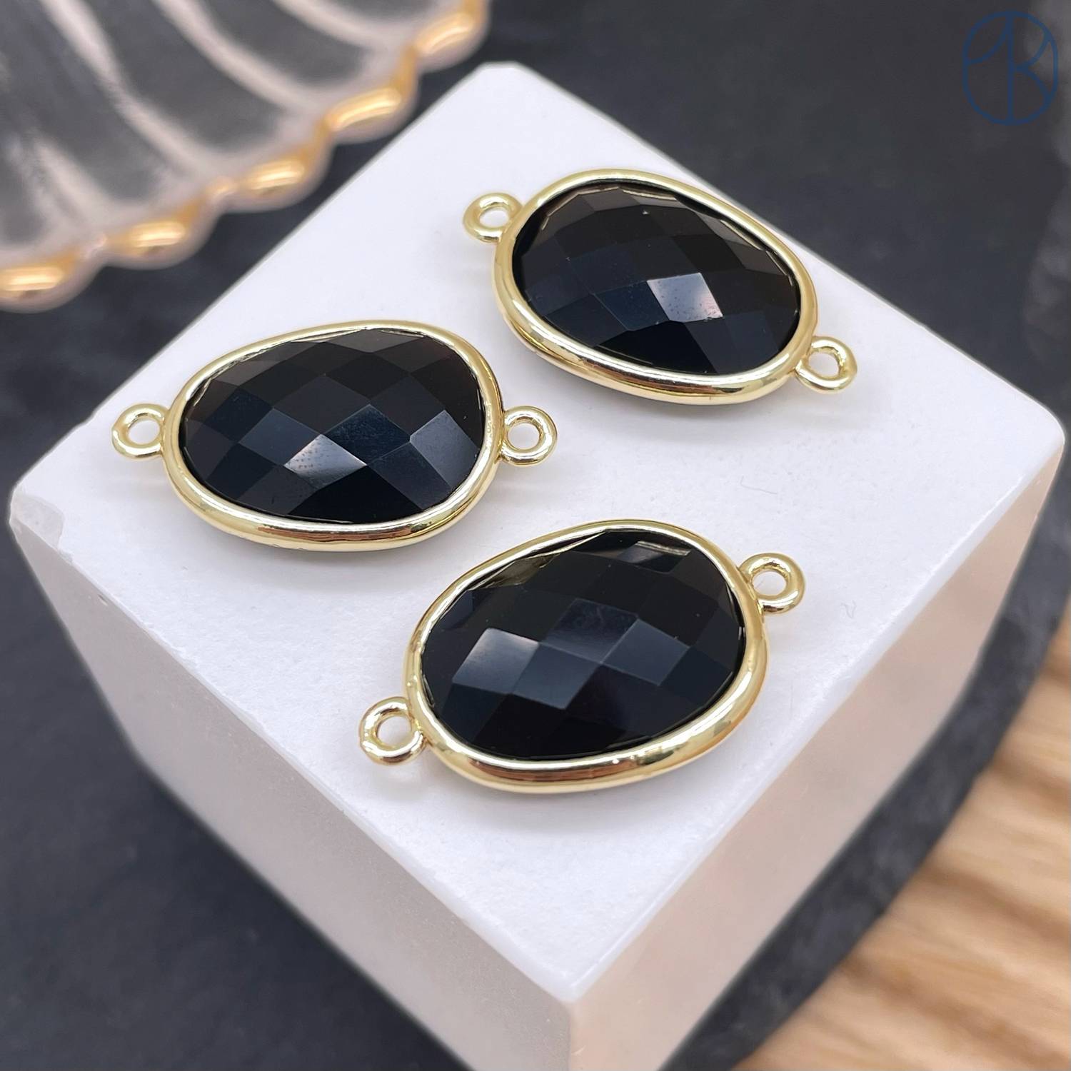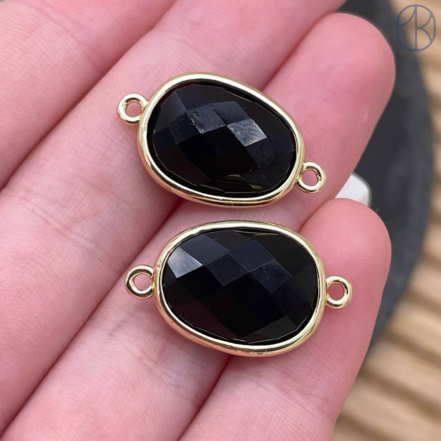 Коннектор овал огранка агат черный, цвет золото ~ 16 мм