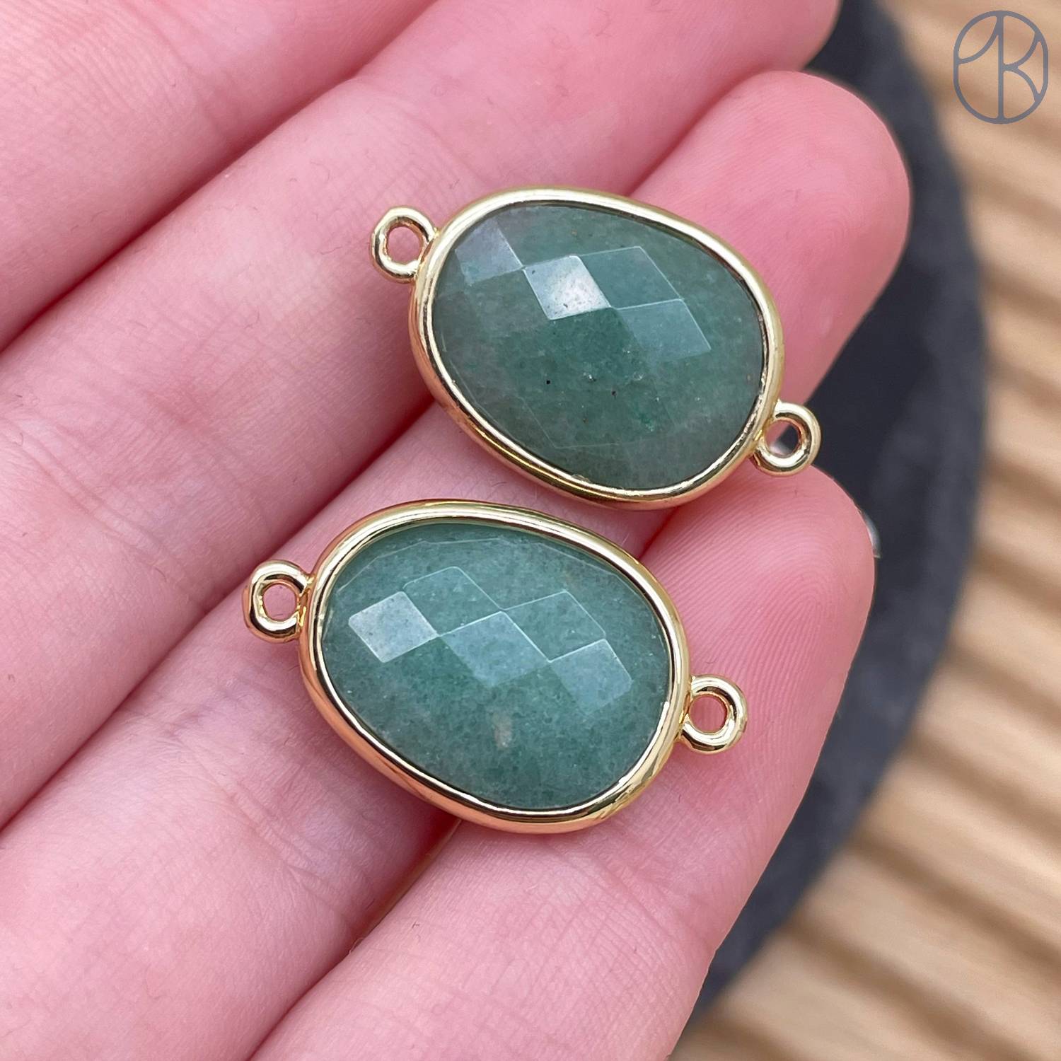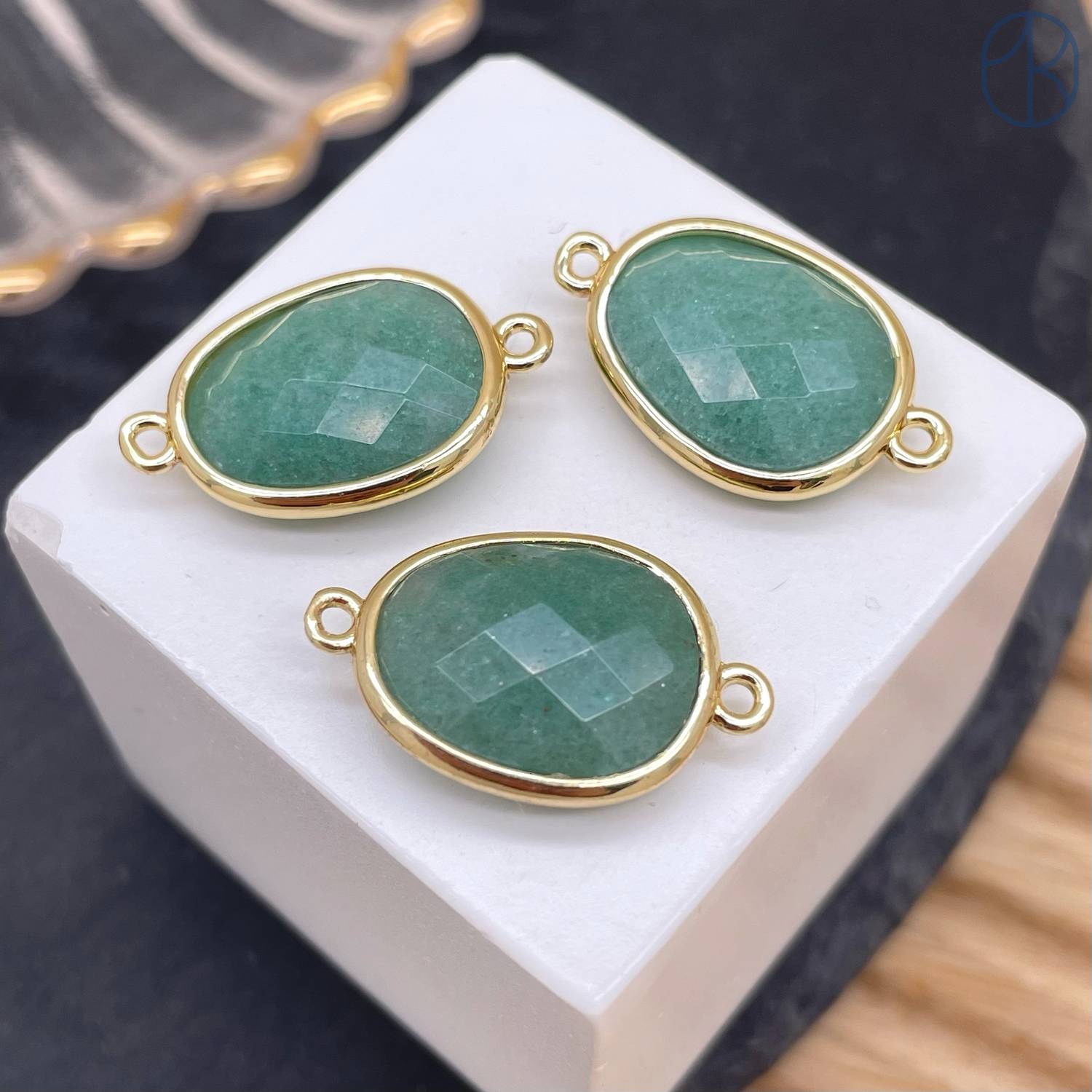 Коннектор овал огранка авантюрин зеленый, цвет золото ~ 16 мм