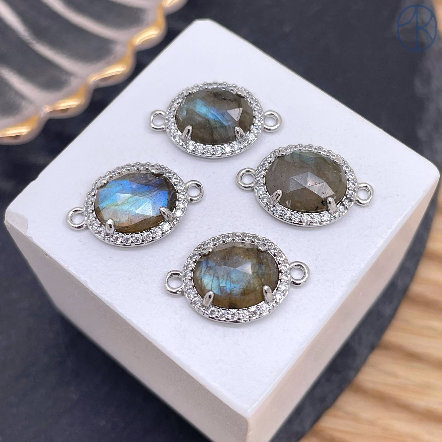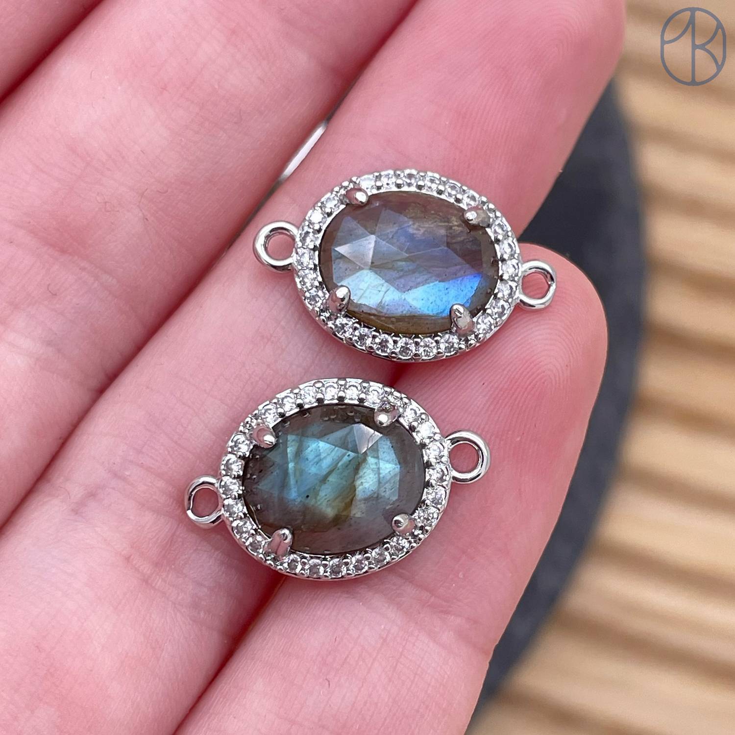 Коннектор овал огранка цирконы лабрадор, цвет серебро ~ 12 мм