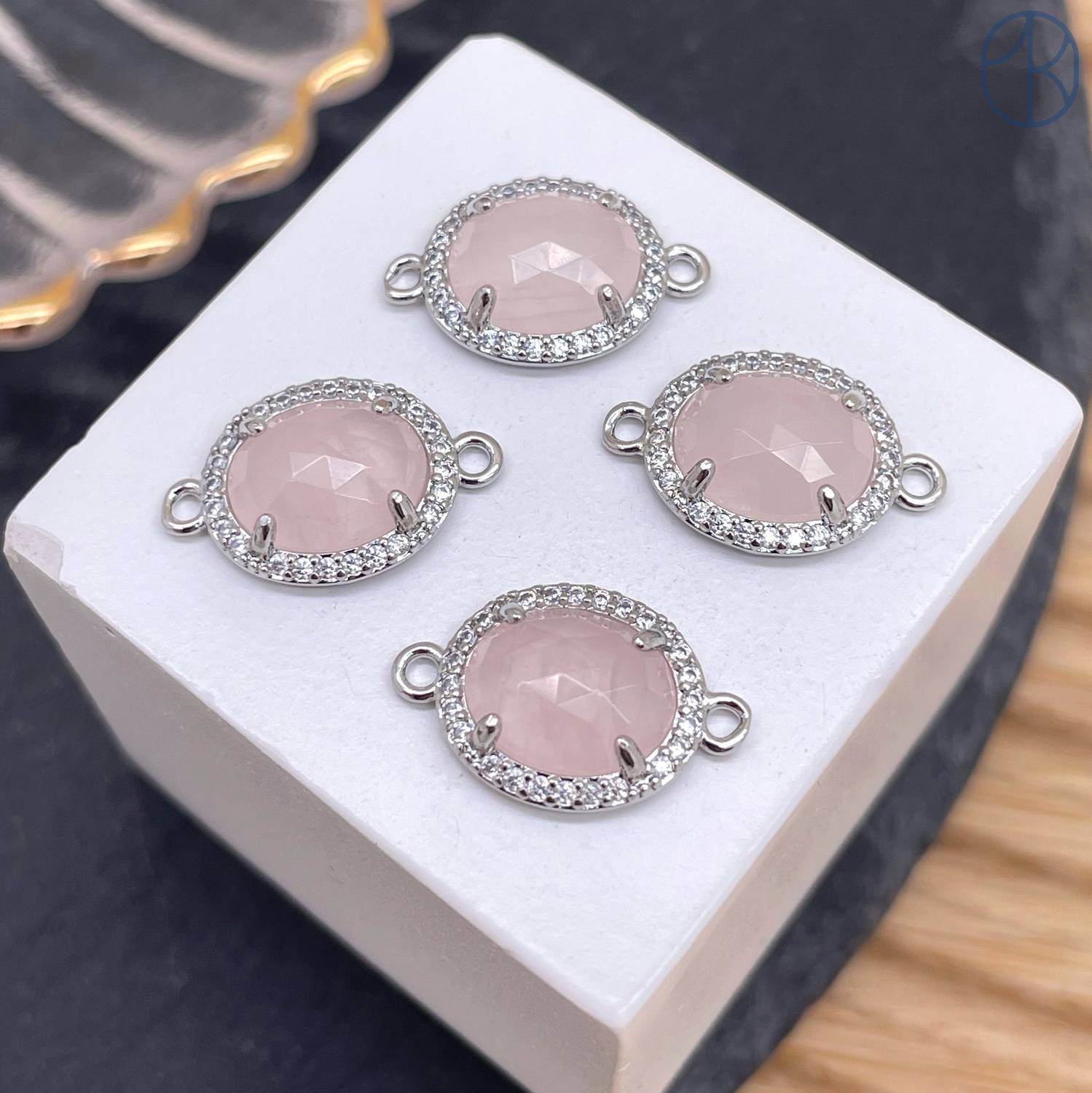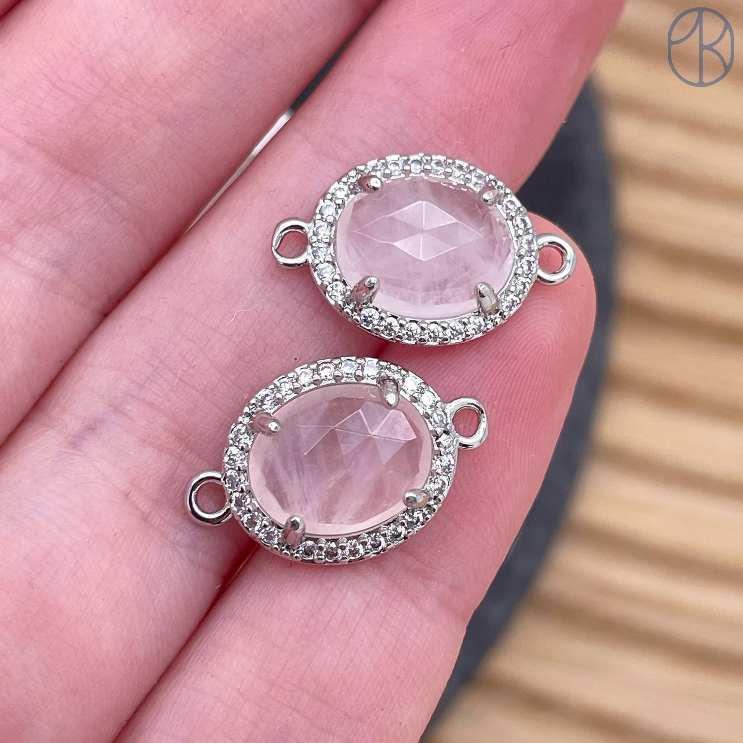 Коннектор овал огранка цирконы розовый кварц, цвет серебро ~ 12 мм