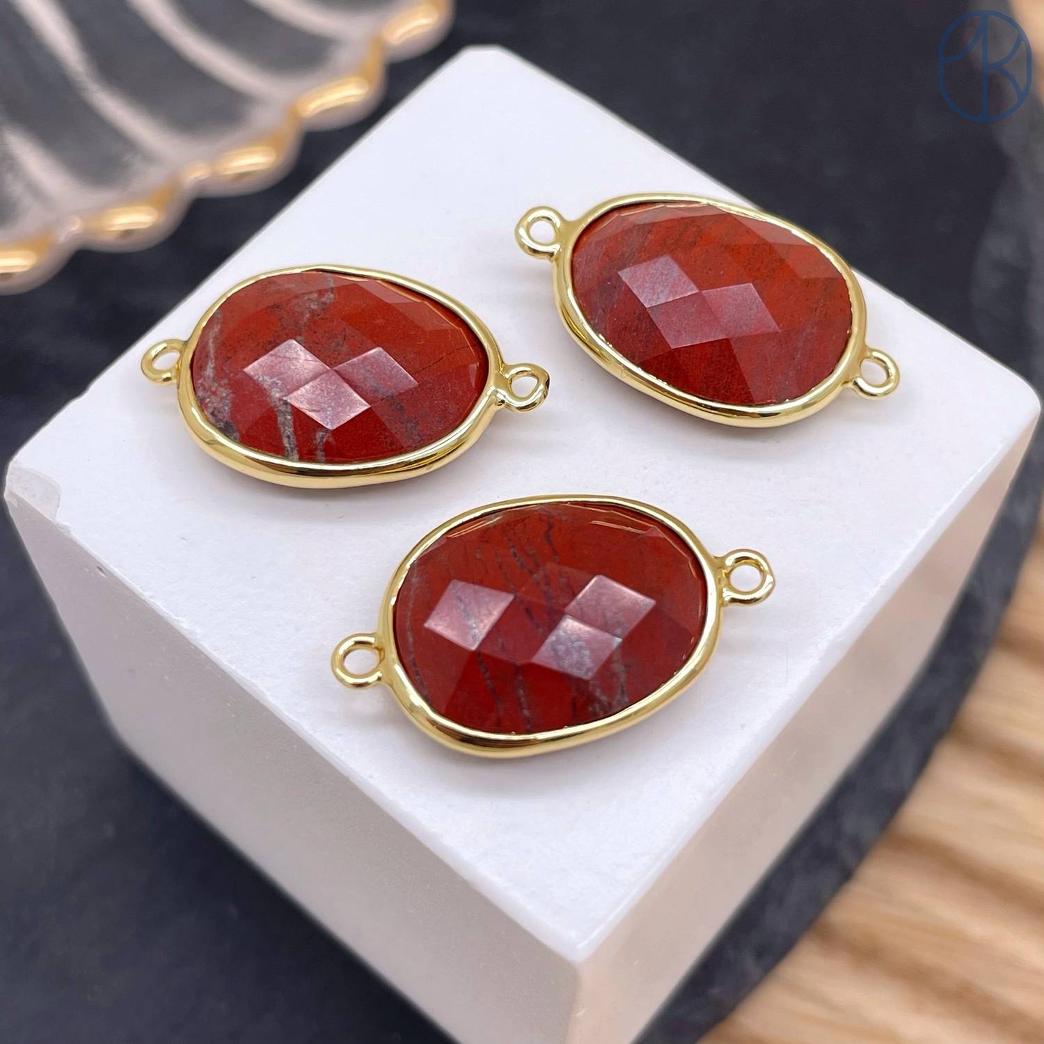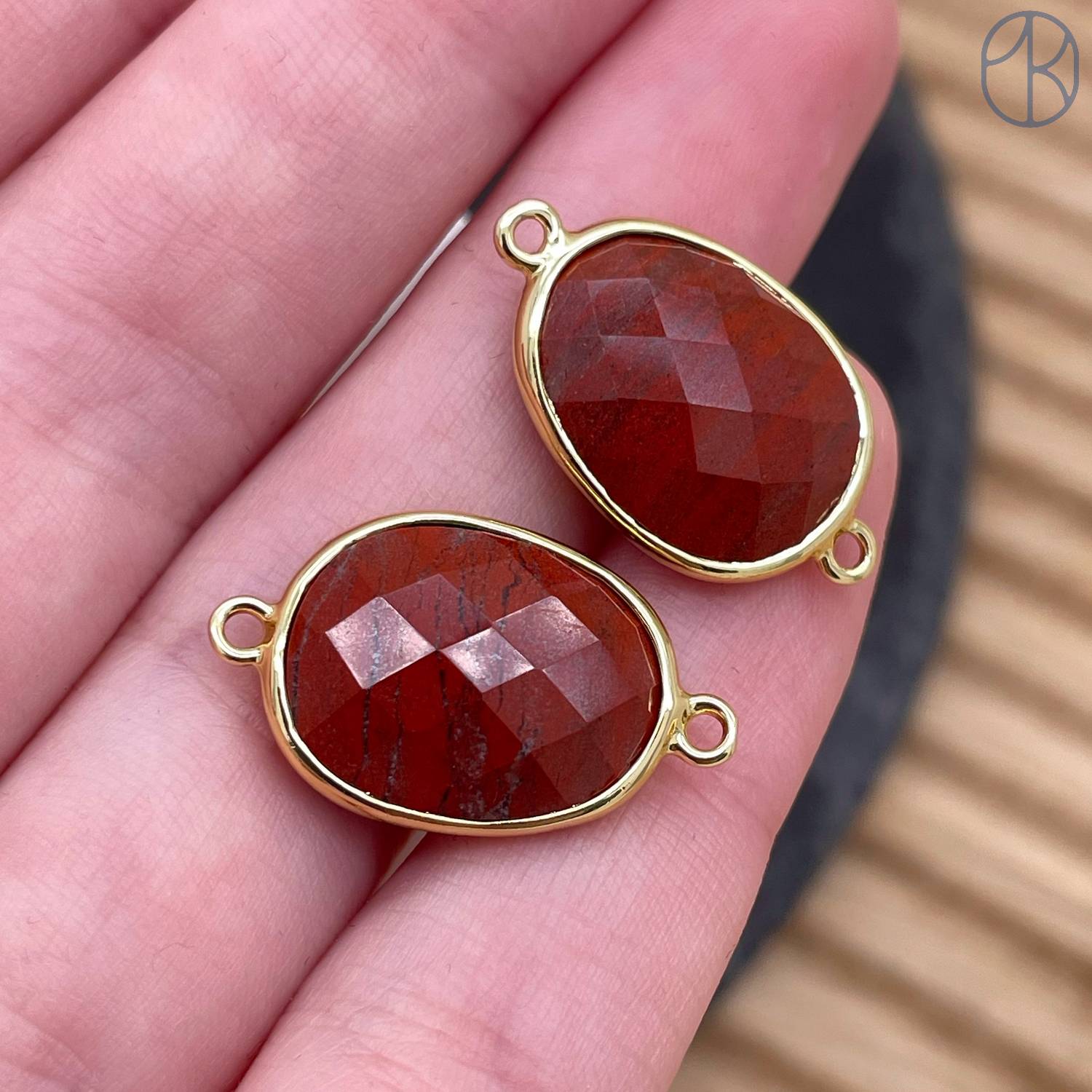 Коннектор овал огранка яшма красная, цвет золото ~ 16 мм