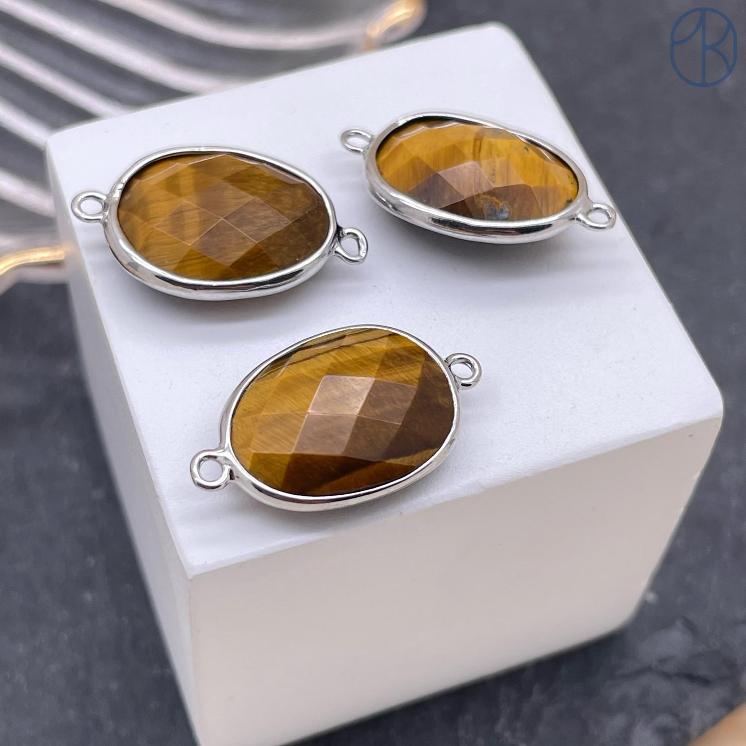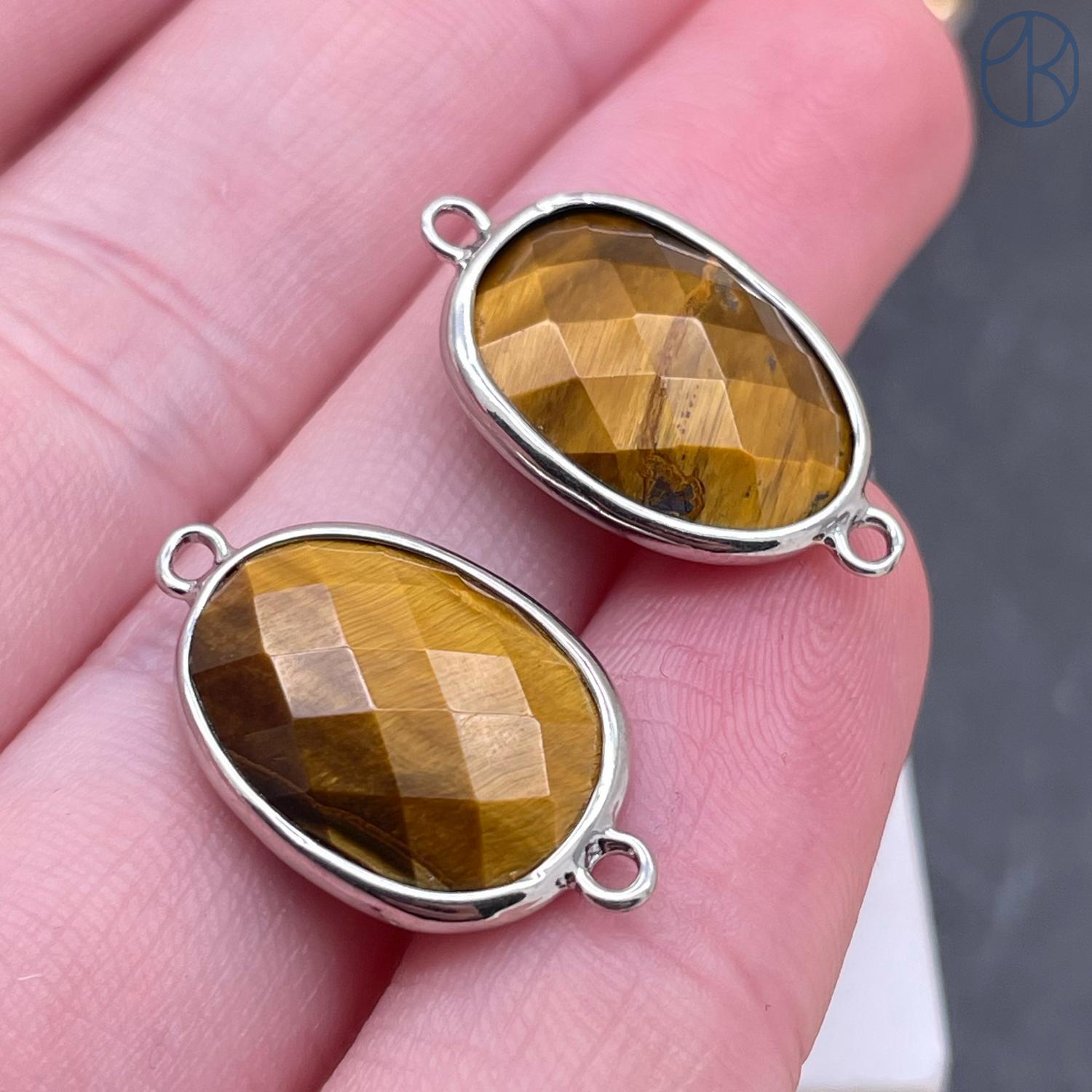 Коннектор овал огранка тигровый глаз, цвет серебро ~ 16 мм