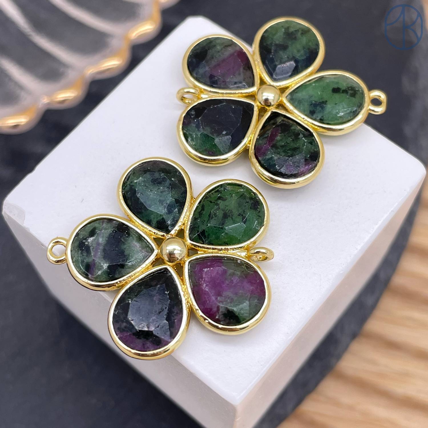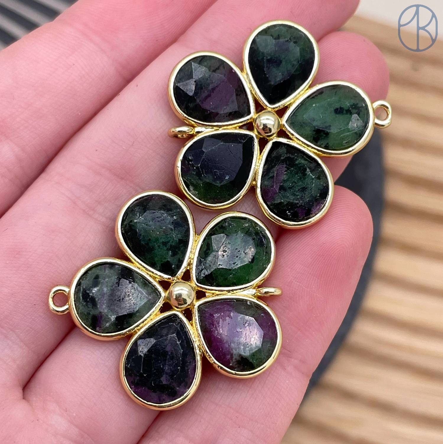 Коннектор цветок огранка цоизит, цвет золото ~ 26 мм