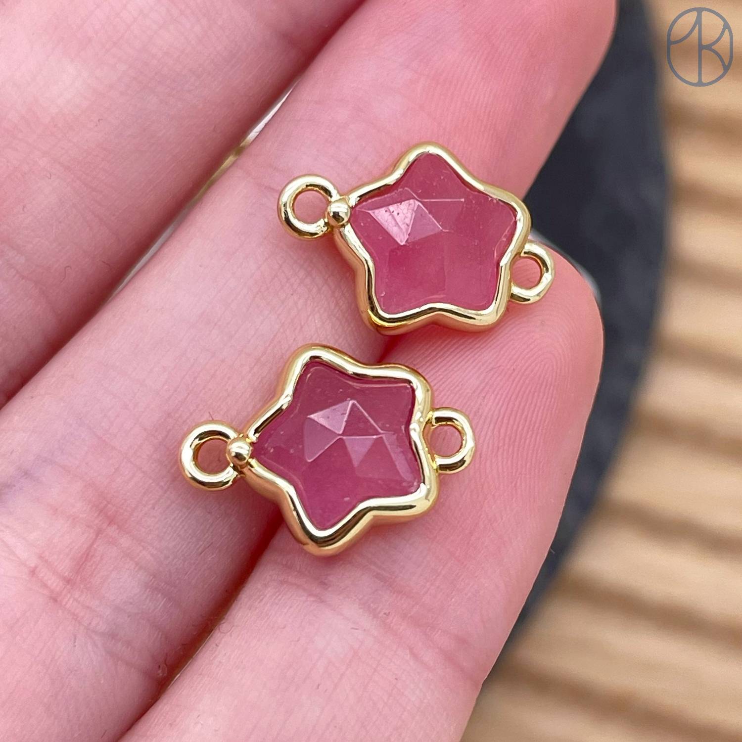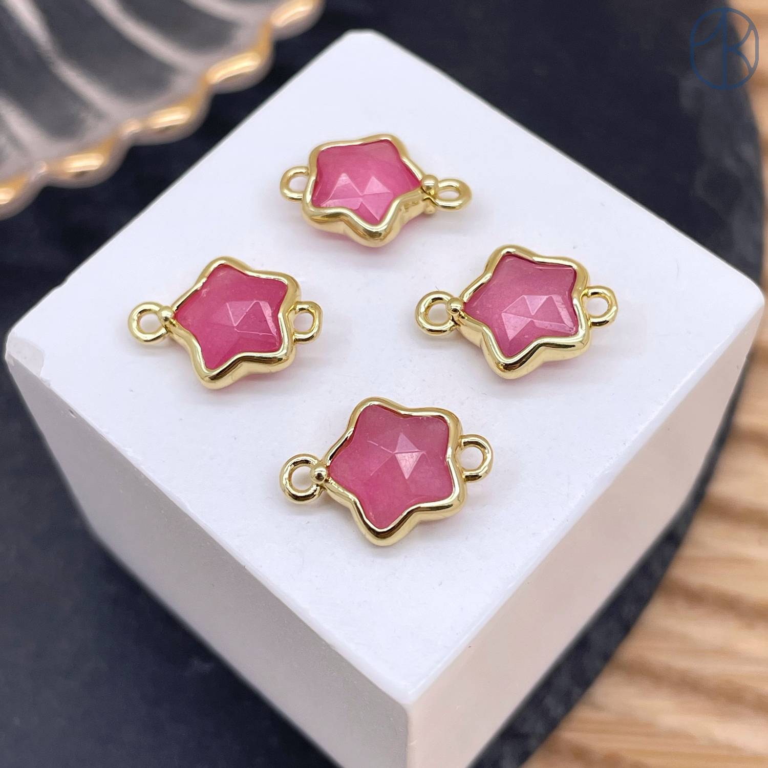 Коннектор звезда огранка кварц розовый тонированный, цвет золото ~ 12 мм